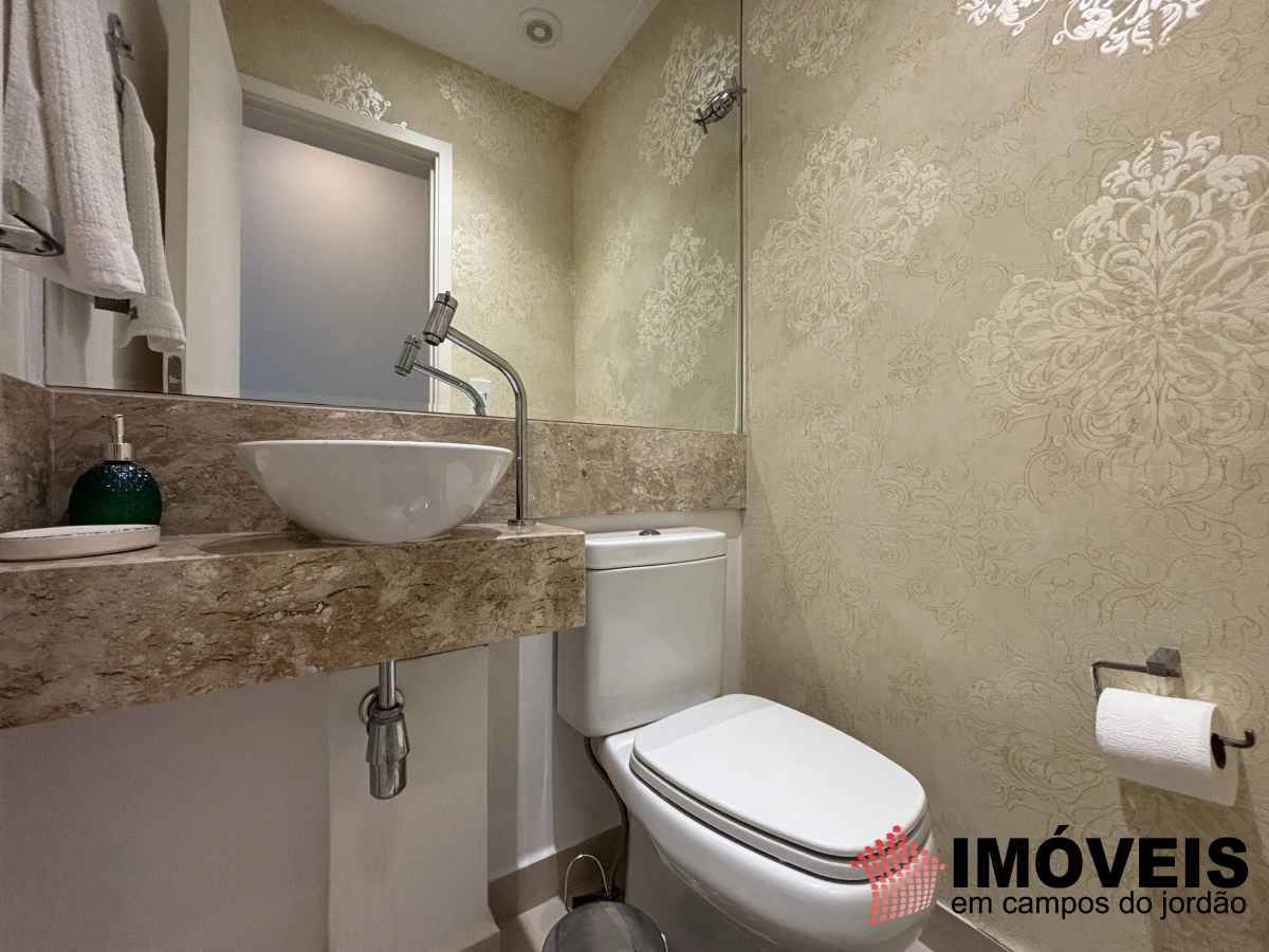 O imóvel dispõe de 3 dormitórios, sendo 1 suíte, além de banheiro social e lavabo, todos com acabamentos refinados. A área social é acolhedora e convidativa, com sala de estar e TV integrada à lareira, criando o cenário perfeito para aproveitar o clima da serra.