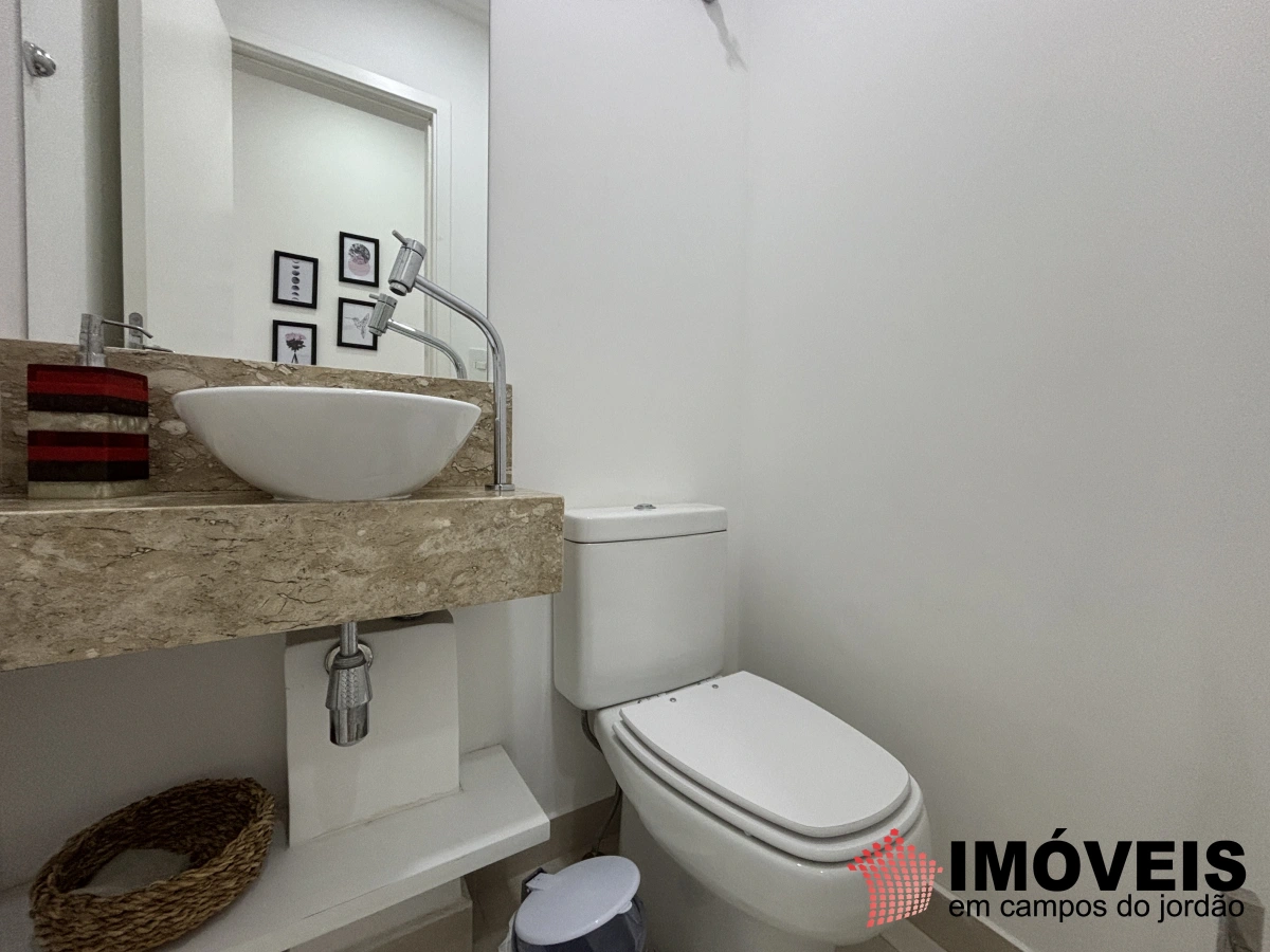 São 3 dormitórios, sendo 1 suíte, além de banheiro social e lavabo, todos com acabamentos de alto padrão. A área social conta com uma aconchegante sala de estar e TV com lareira — perfeita para os dias frios da serra.
