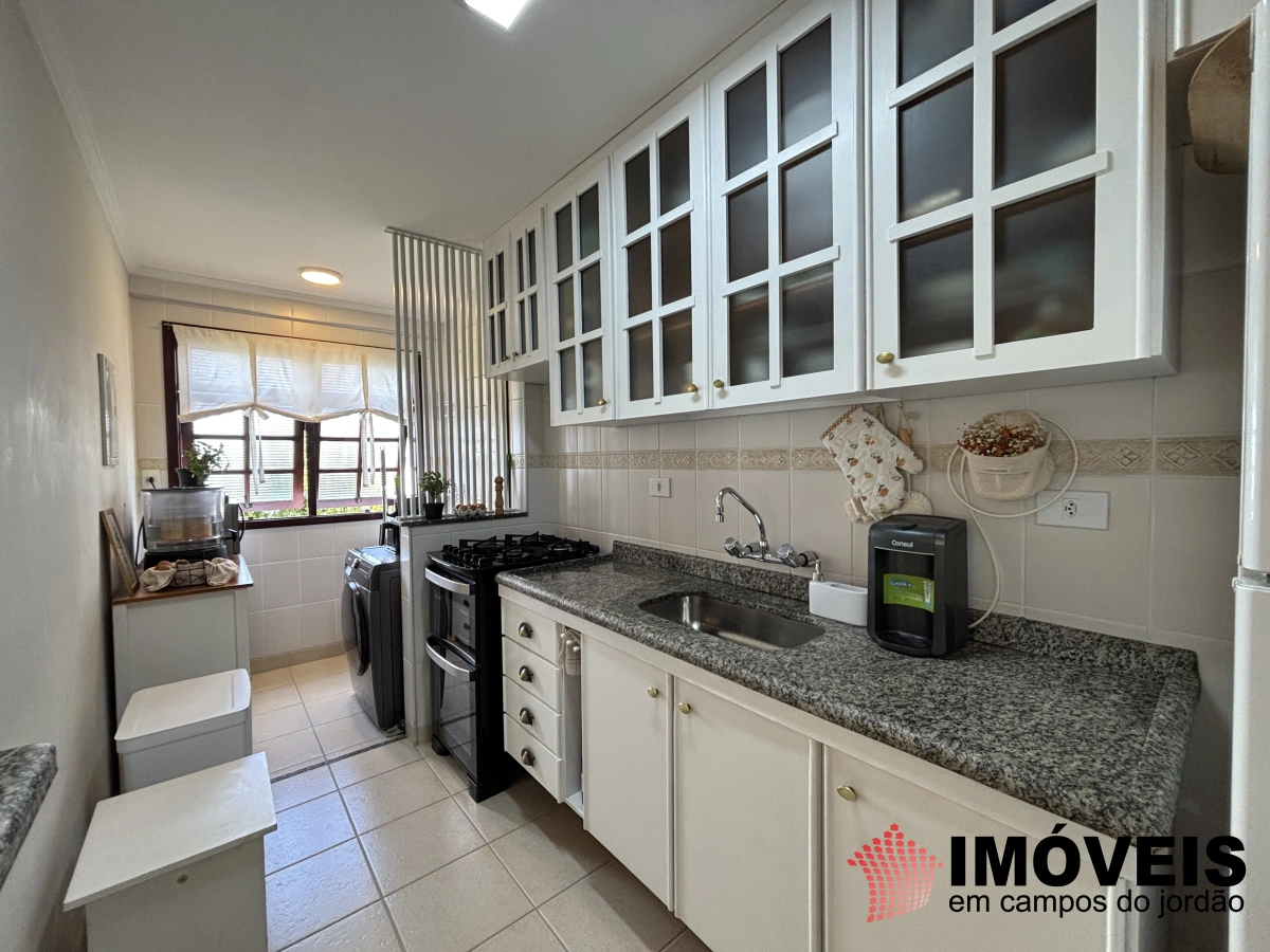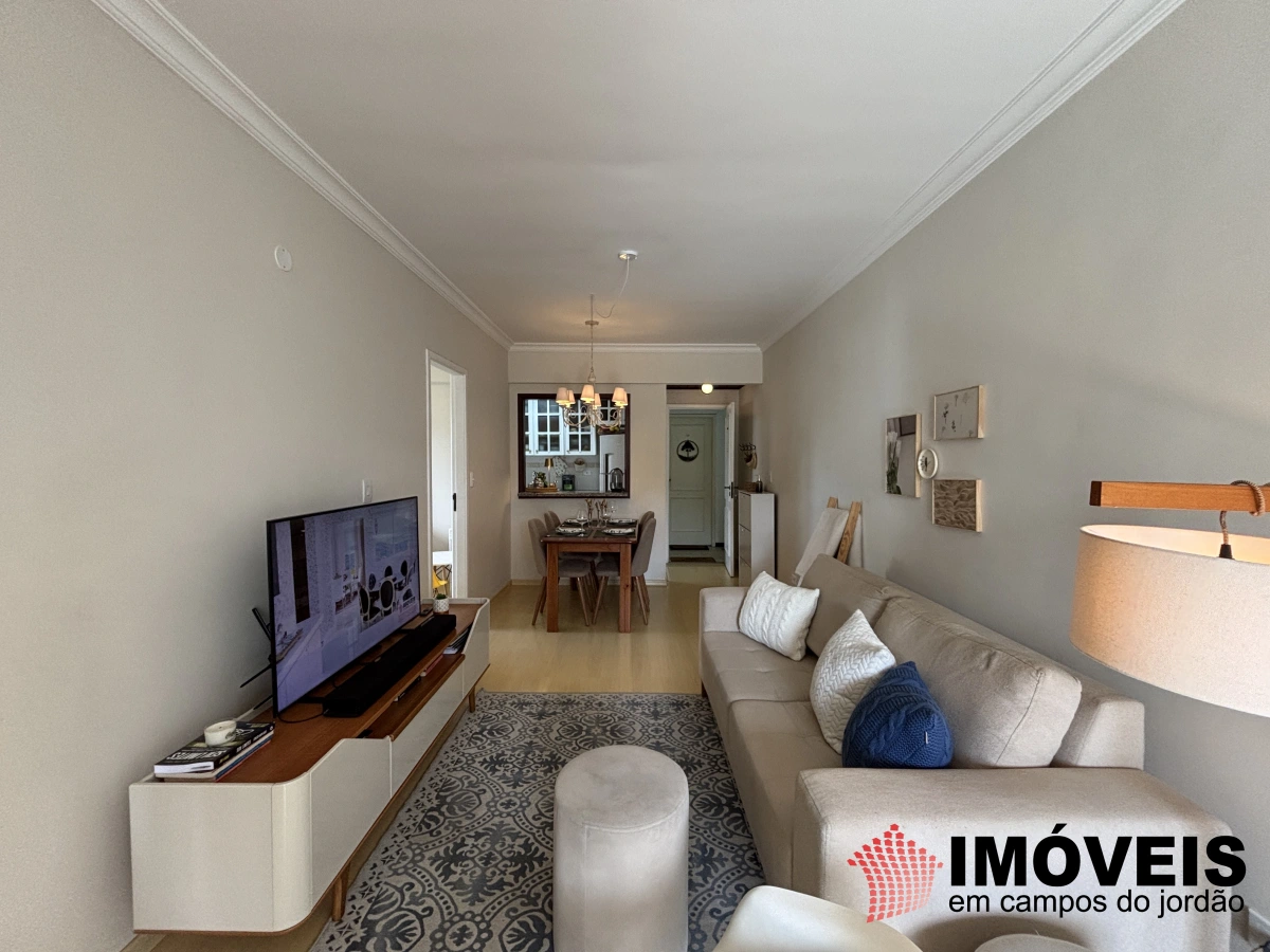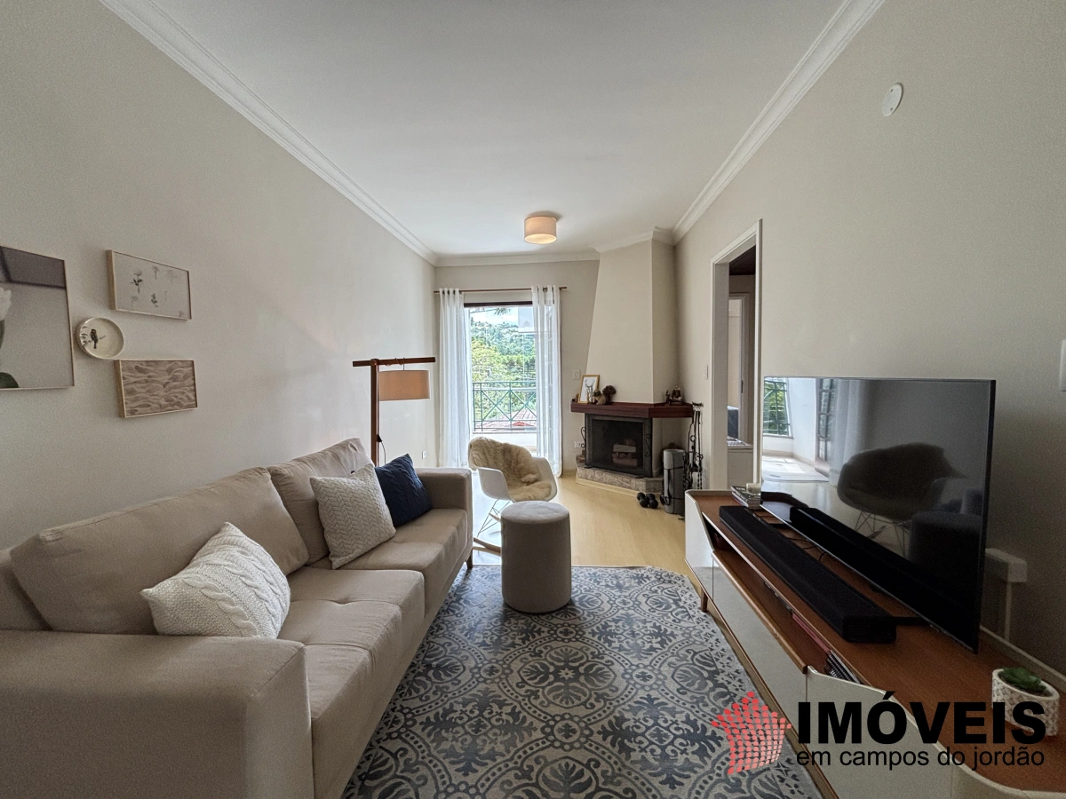 O apartamento é muito bem distribuído, com 1 suíte e 1 dormitório, sala de jantar, cozinha completa com passa-pratos, área de serviço, sala de TV e estar com lareira, além de uma varanda envidraçada que convida a relaxar e apreciar o clima da serra.
