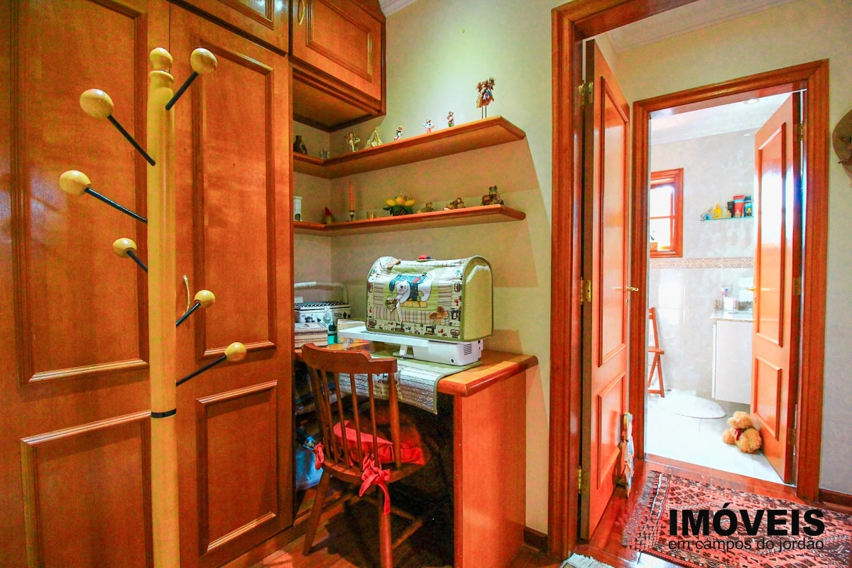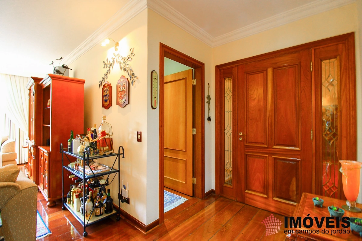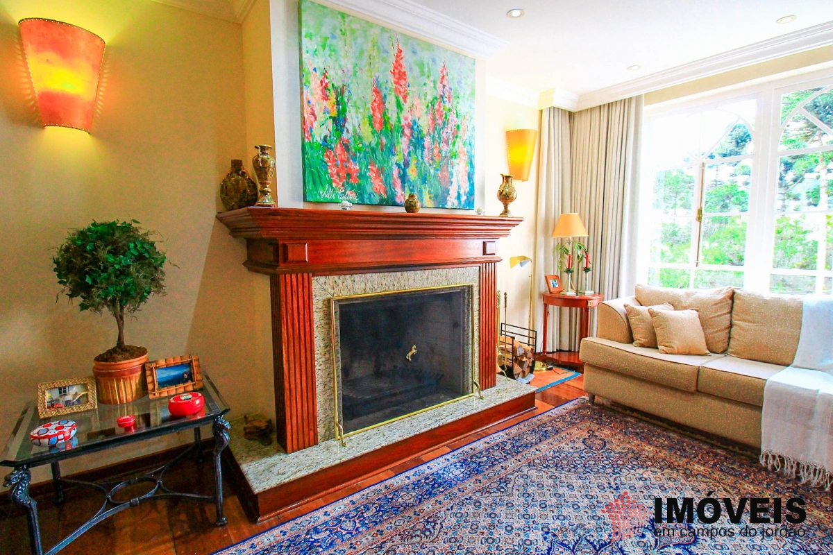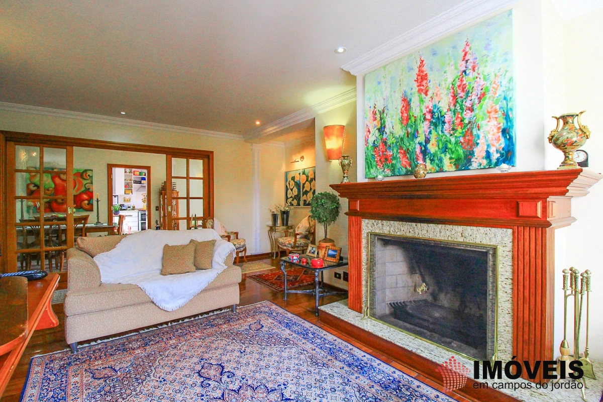 Sala de estar com lareira com o pé direito alto com um visual lindo para o mezanino, ao lado uma sala de carteado com adega, sofá de couro para convidados e um bar completo, sala de jantar com mesa grande que acomoda toda a família, + carrinho de chás, sala de café, cozinha toda equipada com móveis planejados, lavanderia, suíte de empregada; ainda no andar de baixo você conta com lavabo, 02 suítes de casal com varandas e closet. Na parte superior com acesso por uma linda escadaria de madeira e carpete encontra-se o mezanino com vista para a sala de estar. No mezanino mais uma sala e um espaço para relaxar. Ao lado esquerdo do mezanino 01 suíte de fino requinte com um amplo banheiro e closet.