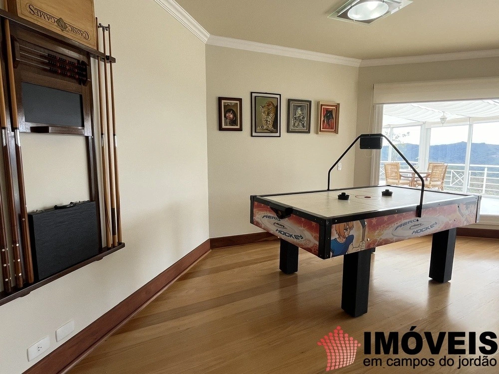 Sala de jogos com mesa de bilhar, mesa de xadrez, carteado e mesa de Hockey.