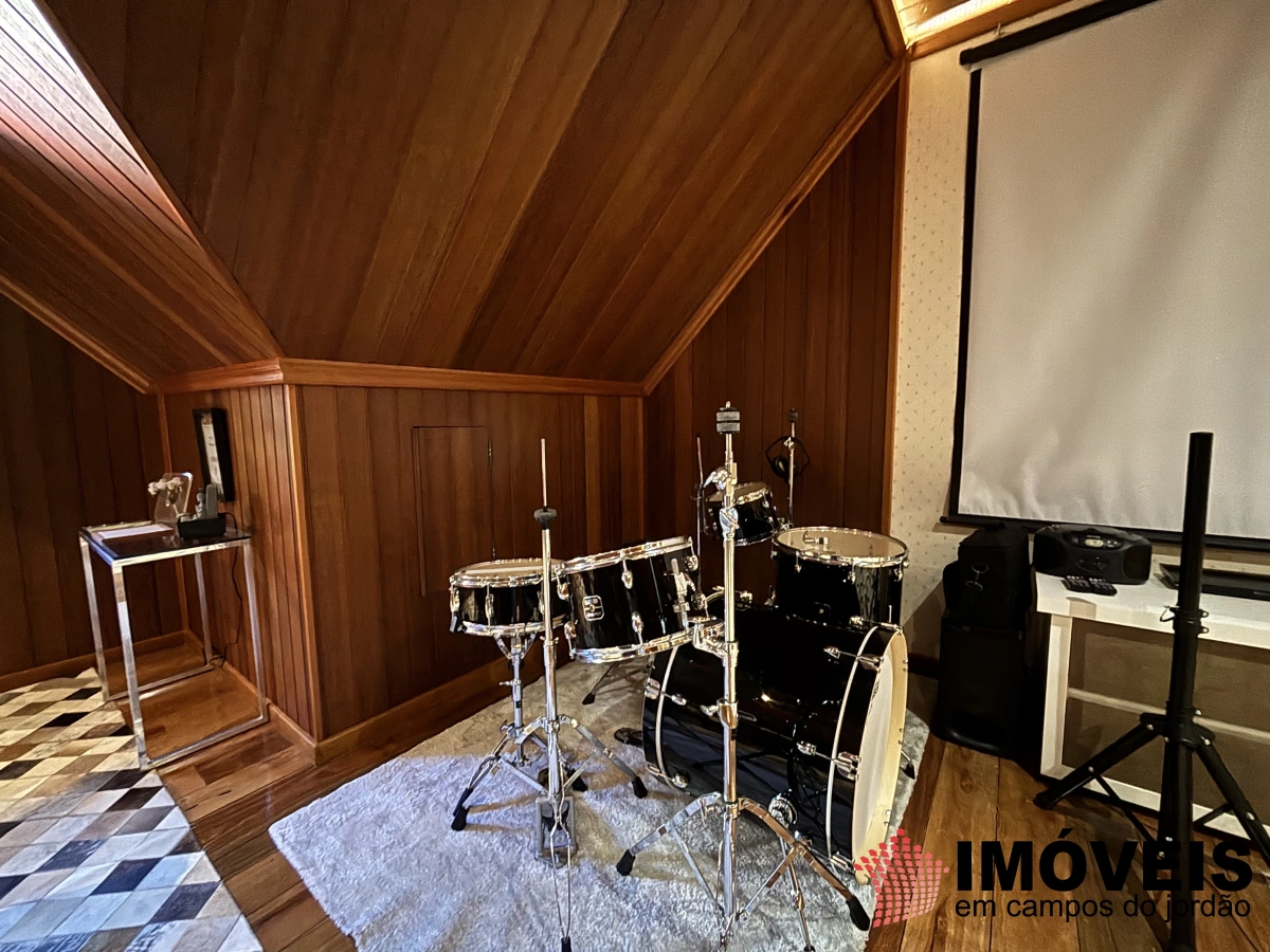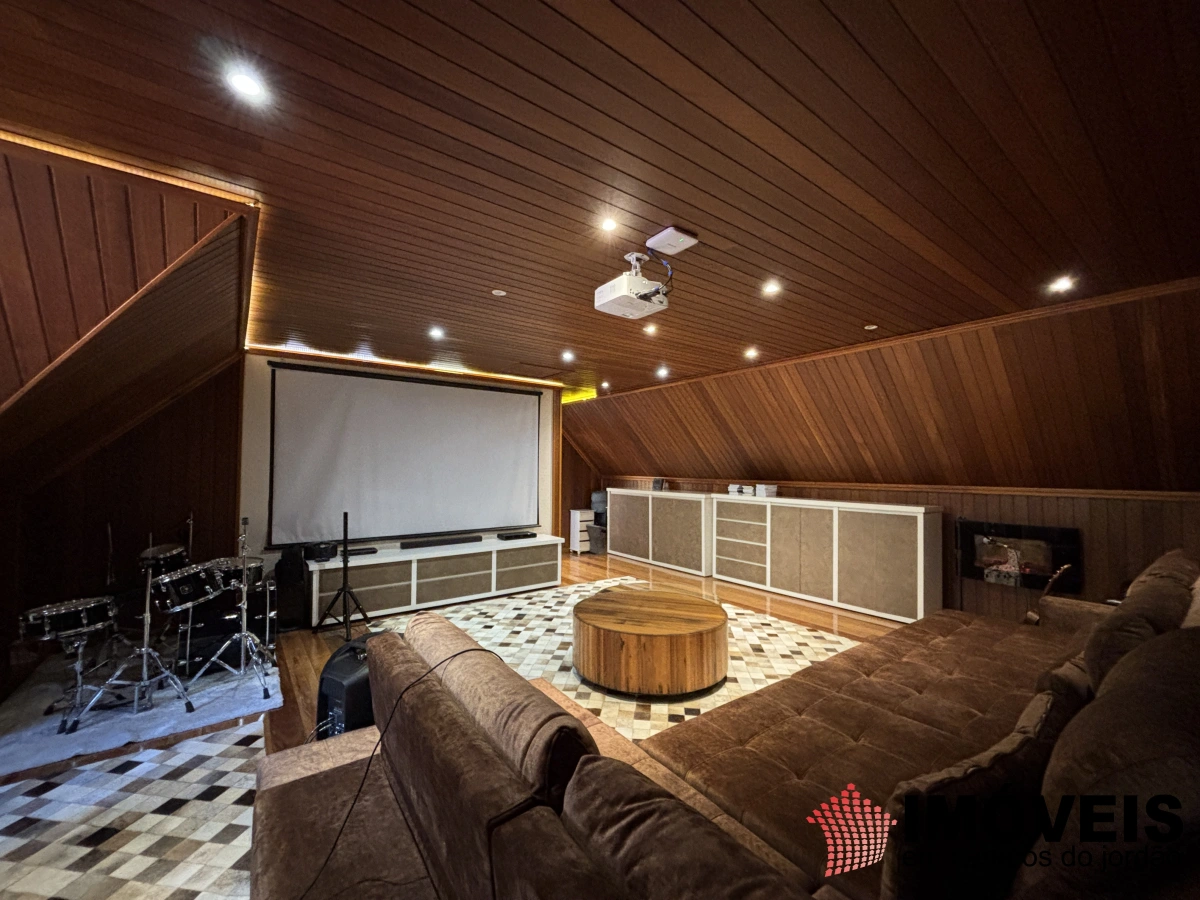 Sala de cinema com projetor e espaço musical