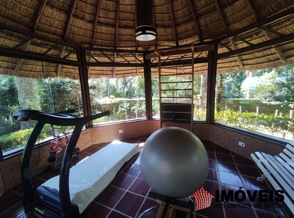 - Do lado de fora, uma pequena construção com academia interna, já equipada com esteira, bola de Pilates e alteres. Também pode ser transformada em um quiosque gourmet.