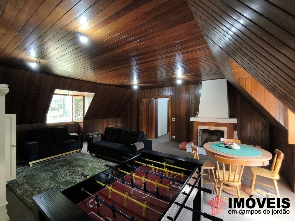 ⚜️ O piso superior ainda conta com mais um banheiro e uma aconchegante sala de TV com lareira, mesa de pebolim e carteado, criando o ambiente perfeito para o lazer da família e amigos.