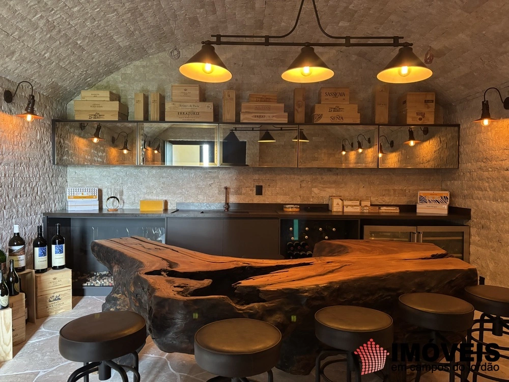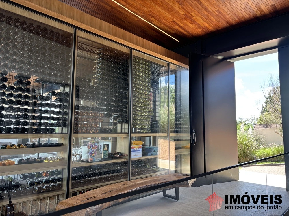 Duas adegas sendo uma climatizada toda em vidro para aproximadamente 1.300 garrafas e outra para armazenar e degustar vinhos no local.