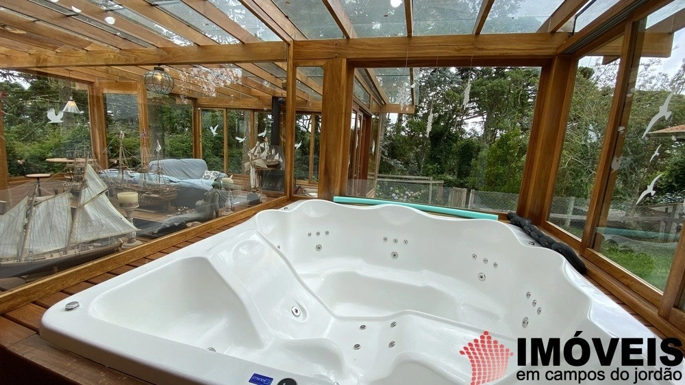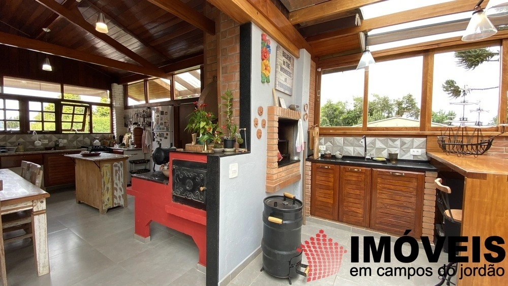 Atrás da casa principal tem mais uma área social espetacular, com sala de música com banheiro que pode ser suíte já que tem uma porta que isola esse espaço dos demais, um spa 8 lugares projetado com maestria, onde você terá o prazer de se mimar com um banho revigorante na hidromassagem, área gourmet com churrasqueira sendo possível assar churrasco dos dois lados , fogão à lenha, forno industrial, mais uma sala de estar com lareira nesse espaço todo envidraçado com vidro temperado 10 milímetros. Jardim na frente com árvores frutíferas e araucárias.