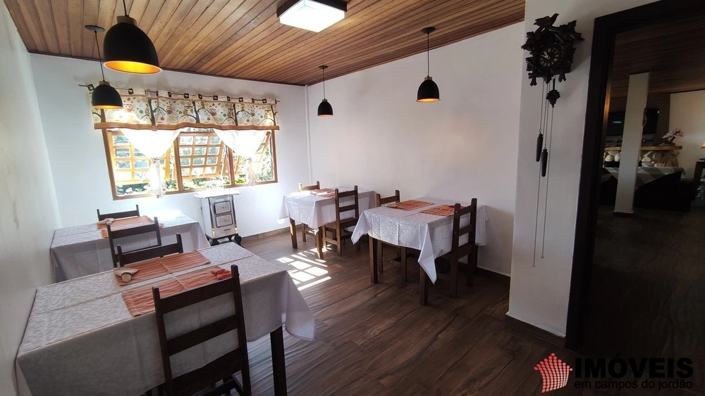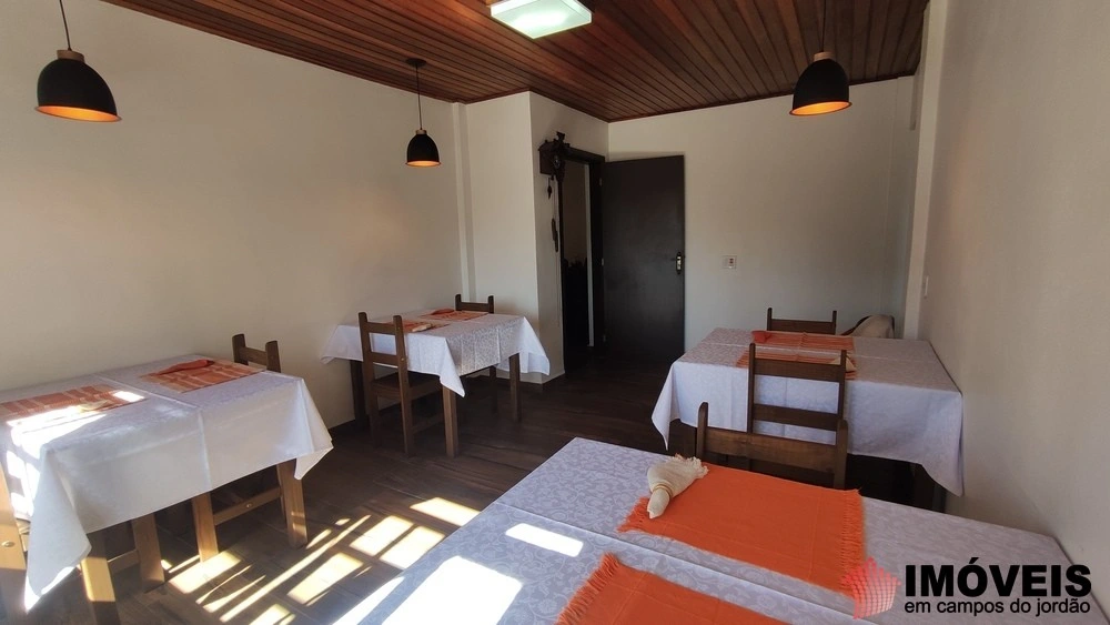Espaço de refeições com 04 mesas de casal para atender os hóspedes que estarão nas 4 charmosas suítes com varanda do andar superior. Se a ideia for morar no imóvel, esse espaço também pode ser uma sala de jantar.