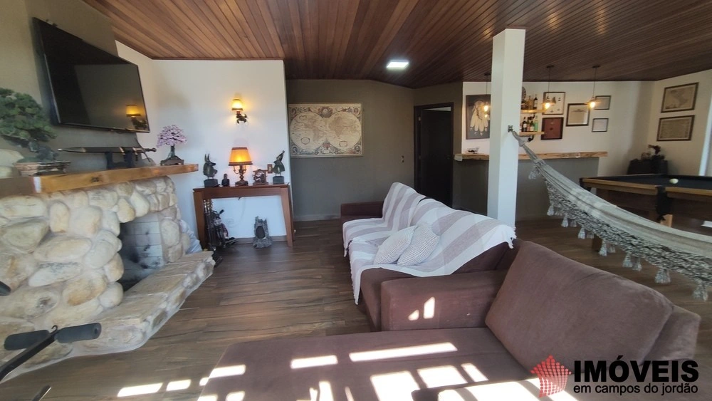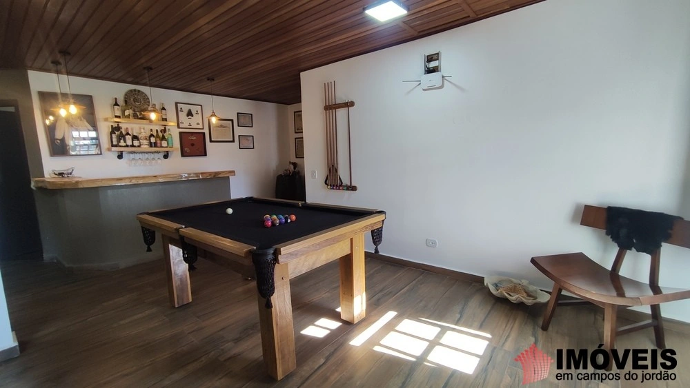 A casa principal conta com uma maravilhosa sala de estar e TV com lareira revestida de pedras, lavabo, barzinho e uma deliciosa rede para você relaxar enquanto aguarda a sua vez na mesa de bilhar.