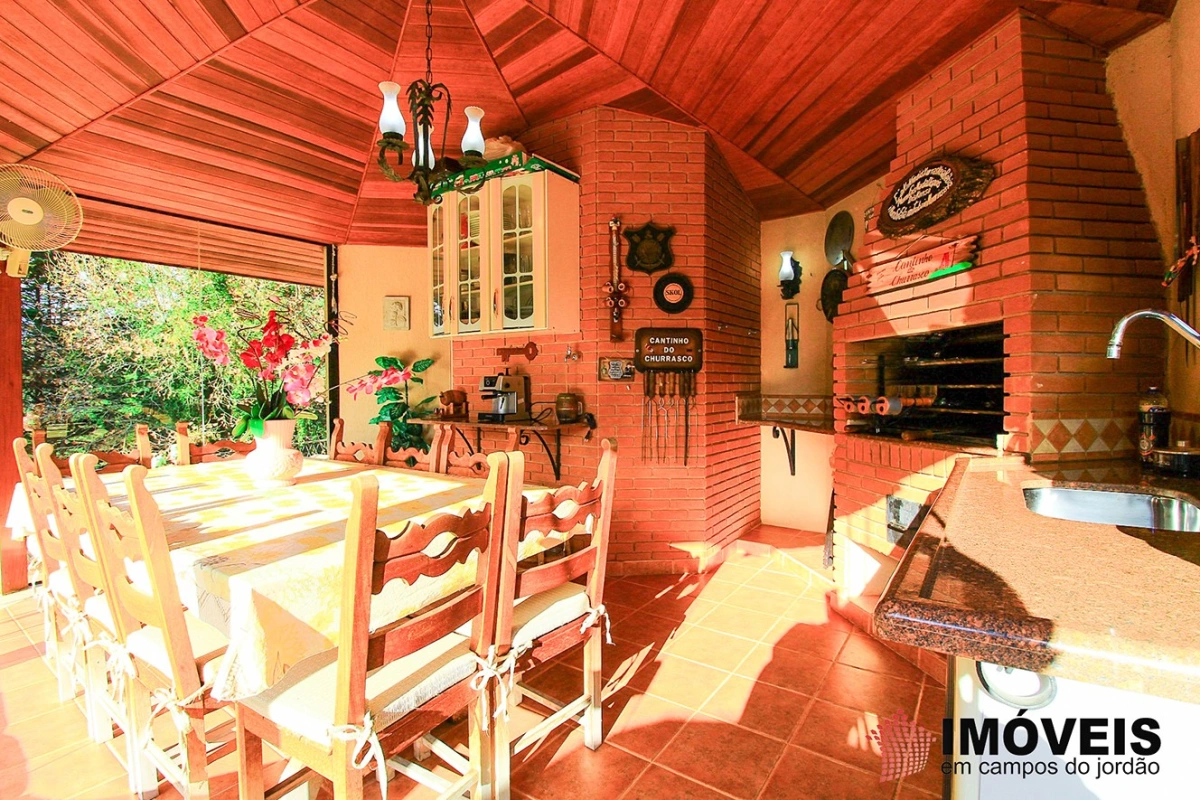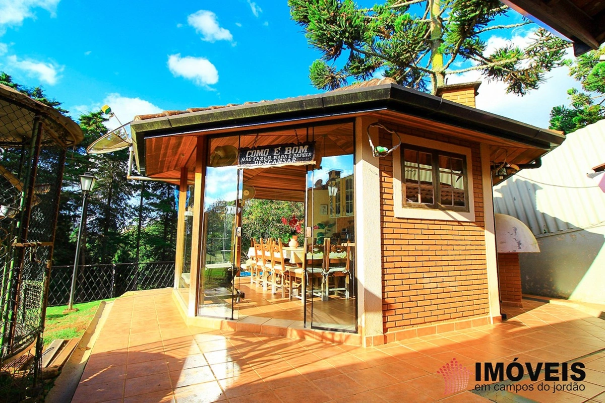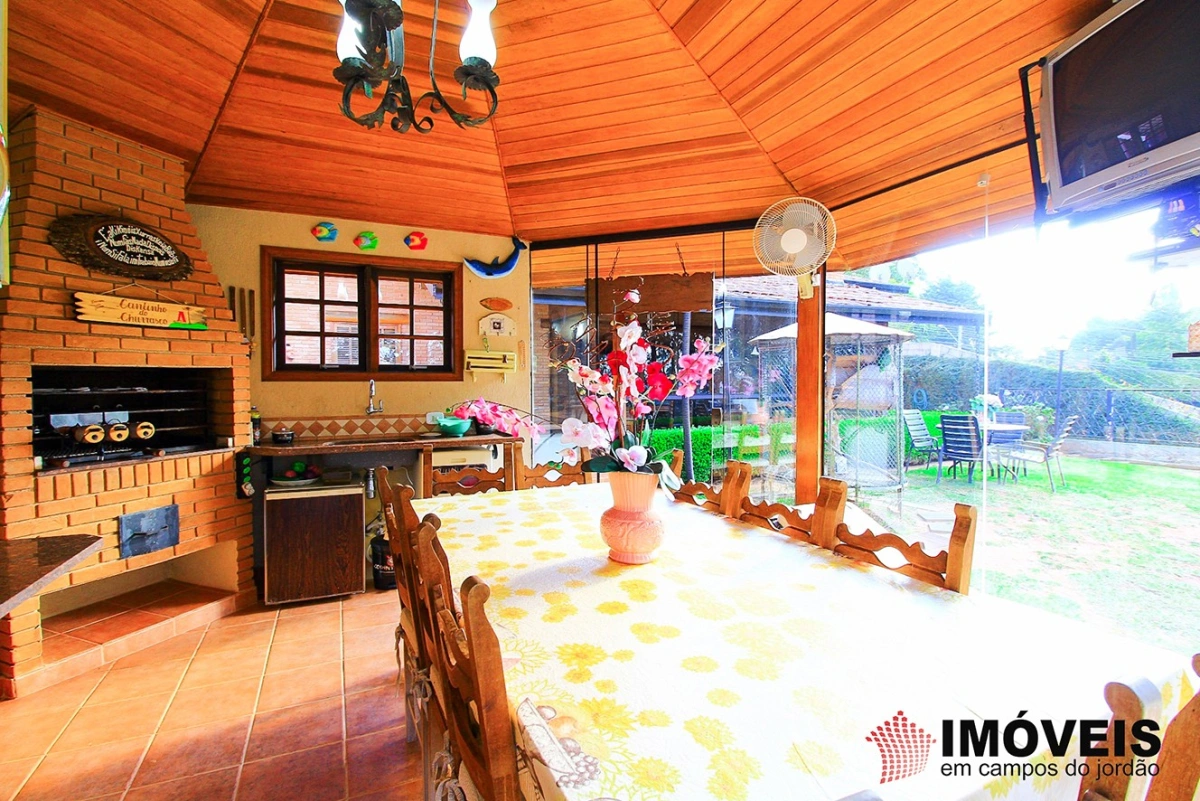 É composta de hall de entrada, 03 dormitórios sendo 01 suíte, 04 banheiros, sala de TV e estar com lareira, gazebo envidraçado com linda vista para o jardim, lavabo, bar e adega, sala de jantar, despensa, cozinha, área de serviço, lavanderia, aquecimento solar, casa de boneca, canil, hobby-box, quiosque com churrasqueira, forno de pizza e lavabo. campinho de futebol. Possui 02 vagas de garagem coberta.