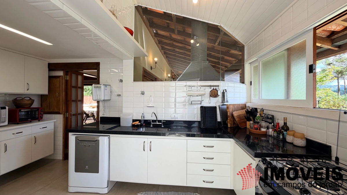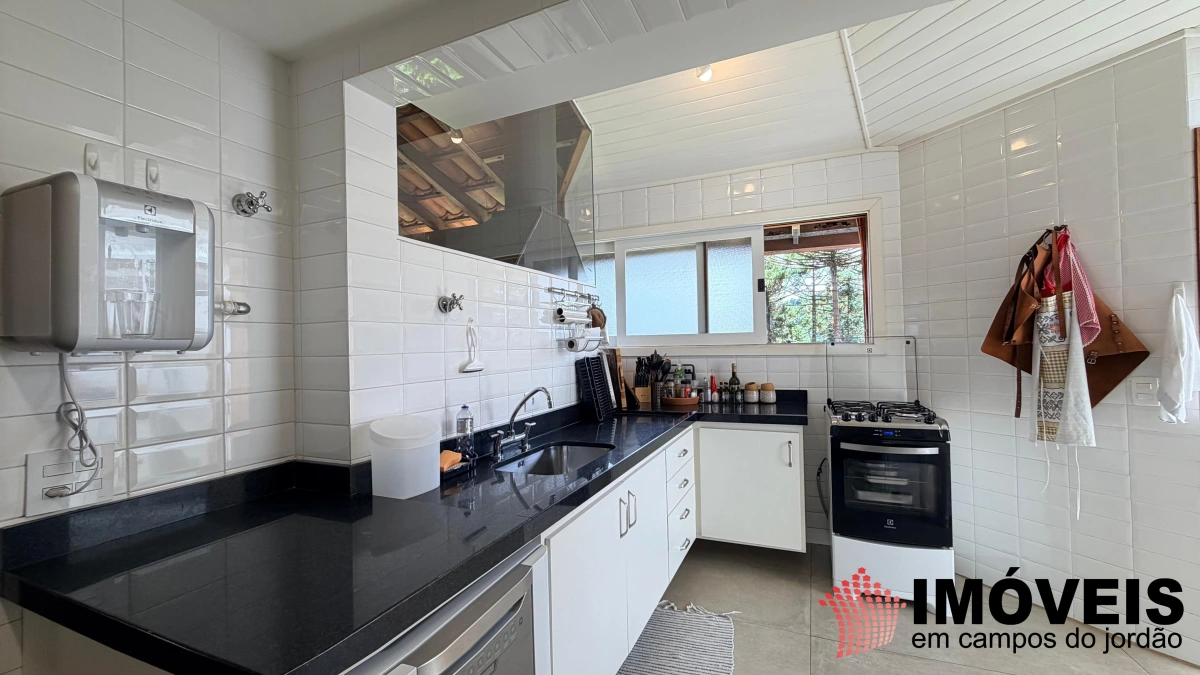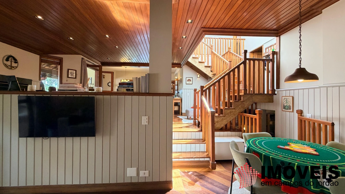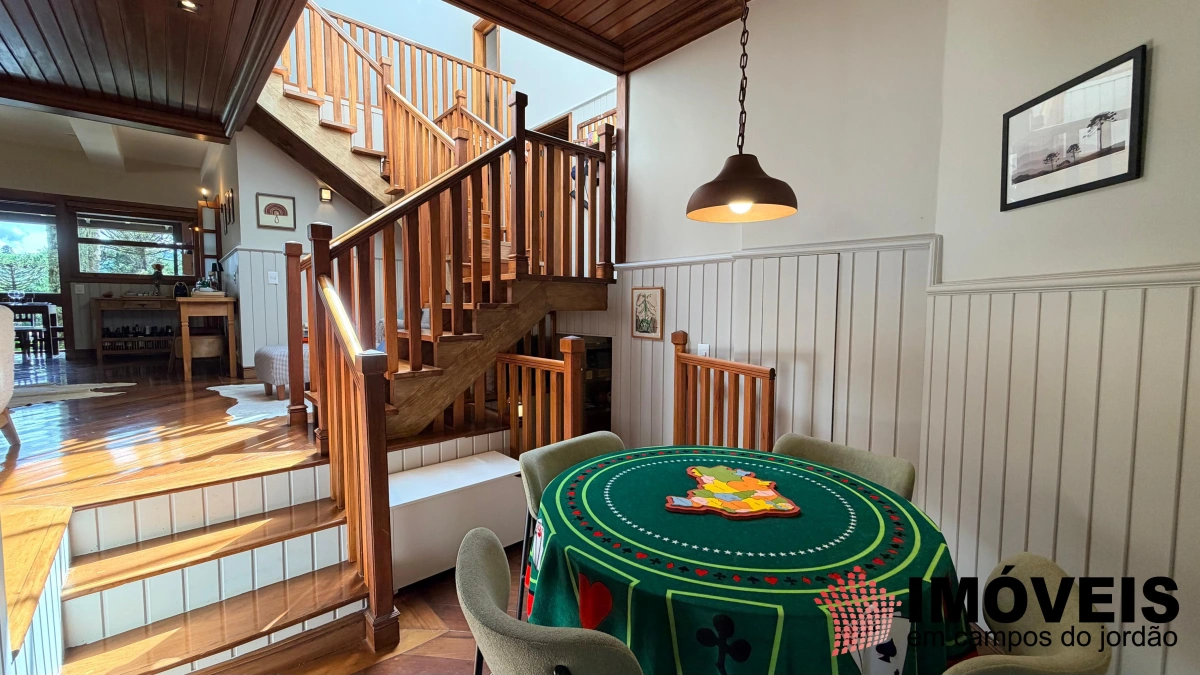 Descendo poucos degraus — com acesso também independente pelo jardim —, revela-se a área social, elegante e perfeitamente integrada. São duas salas de TV (uma delas com piso em carpete), sala de jogos e uma imponente sala de estar com lareira, que se conecta harmoniosamente à sofisticada sala de jantar, com mesa quadrada, piso em madeira maciça impecável e teto em madeira valorizado por iluminação contemporânea. Todos os ambientes se estendem à ampla varanda gourmet, equipada com churrasqueira, além de espaços aconchegantes com sofás, poltronas e redes — ideais para receber e desfrutar do clima da serra. A cozinha é ampla, funcional e totalmente equipada, acompanhada de área de serviço.
