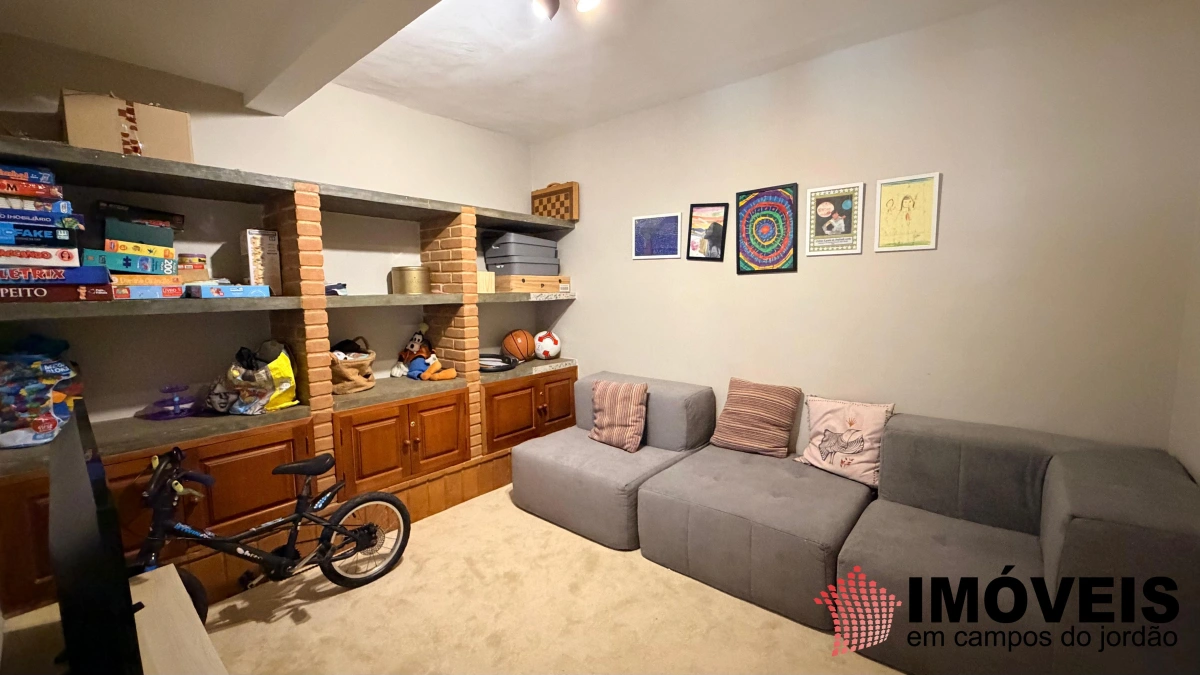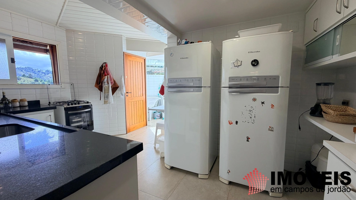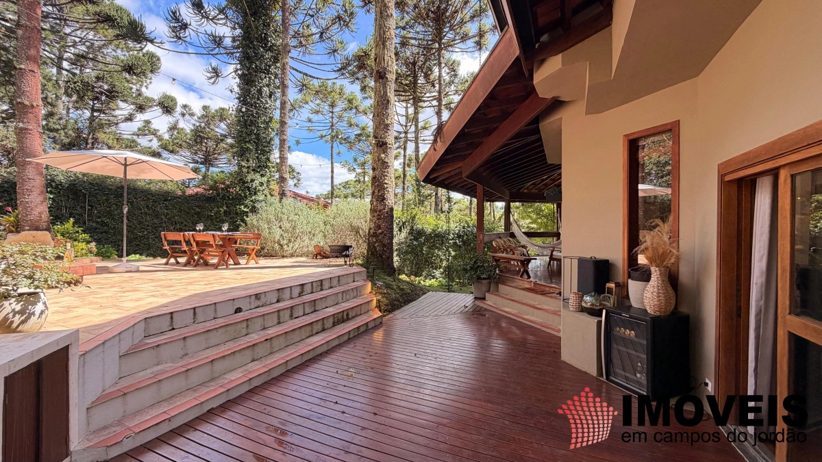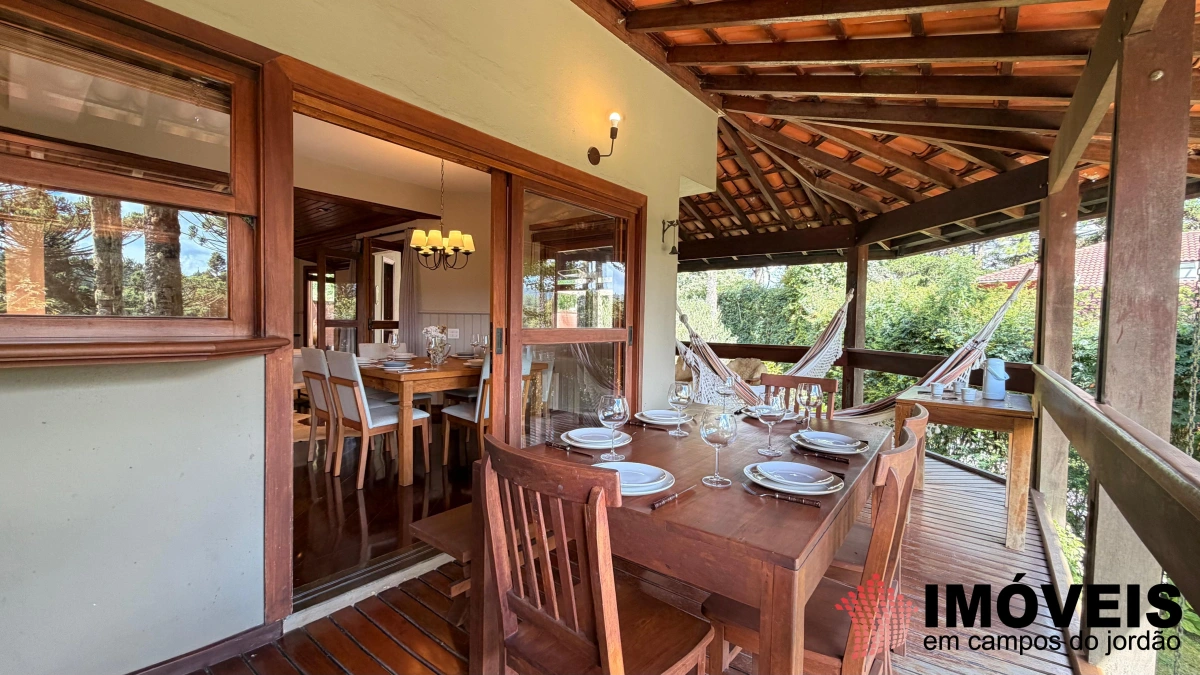Descendo poucos degraus — com acesso também independente pelo jardim —, revela-se a área social, elegante e perfeitamente integrada. São duas salas de TV (uma delas com piso em carpete), sala de jogos e uma imponente sala de estar com lareira, que se conecta harmoniosamente à sofisticada sala de jantar, com mesa quadrada, piso em madeira maciça impecável e teto em madeira valorizado por iluminação contemporânea. Todos os ambientes se estendem à ampla varanda gourmet, equipada com churrasqueira, além de espaços aconchegantes com sofás, poltronas e redes — ideais para receber e desfrutar do clima da serra. A cozinha é ampla, funcional e totalmente equipada, acompanhada de área de serviço.
