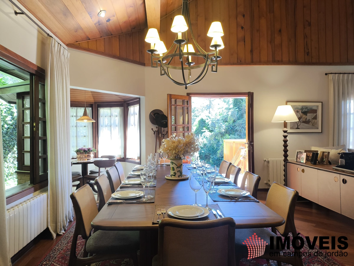 Cada detalhe revela imponência e acolhimento: o pé-direito duplo valoriza a grandiosidade dos ambientes, enquanto a lareira em tijolinhos e os acabamentos em madeira nobre criam uma atmosfera quente, elegante e atemporal. Os espaços foram desenhados para receber, viver e contemplar — da sala de jantar para 10 convidados à delicada sala de chá, tudo convida à experiência.