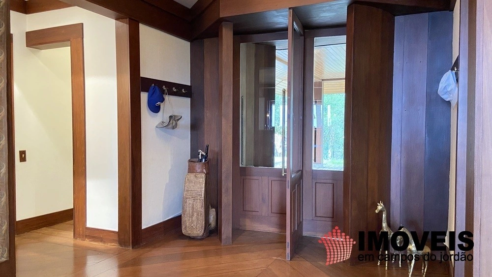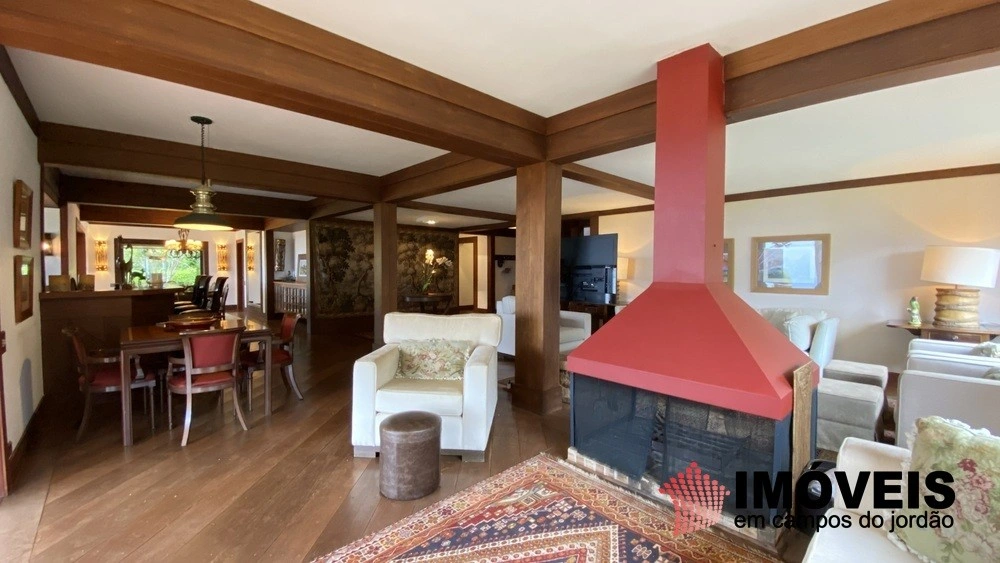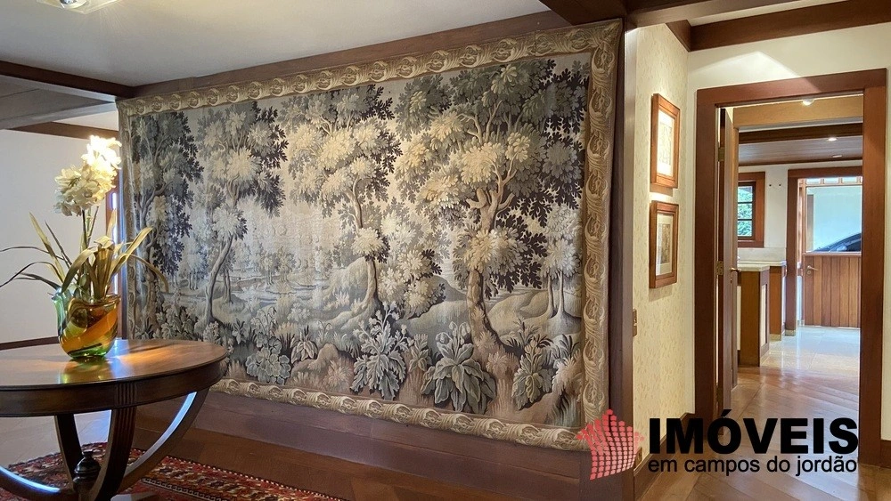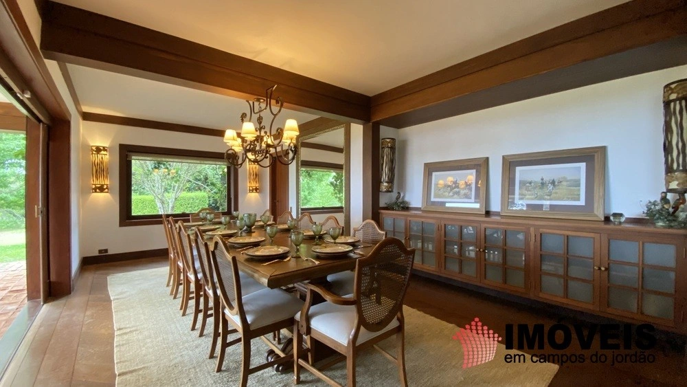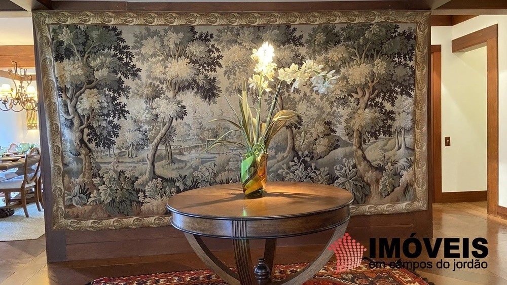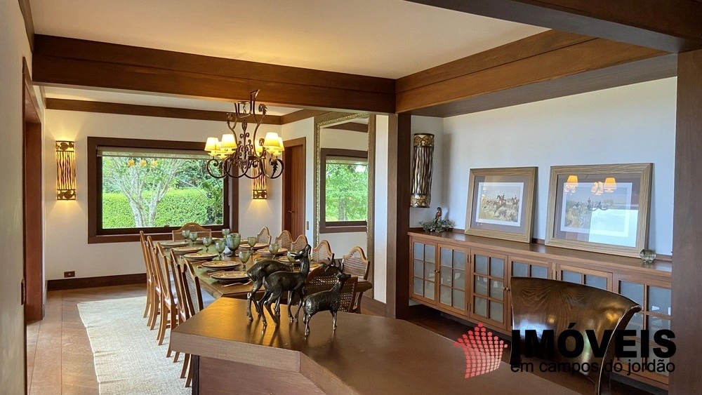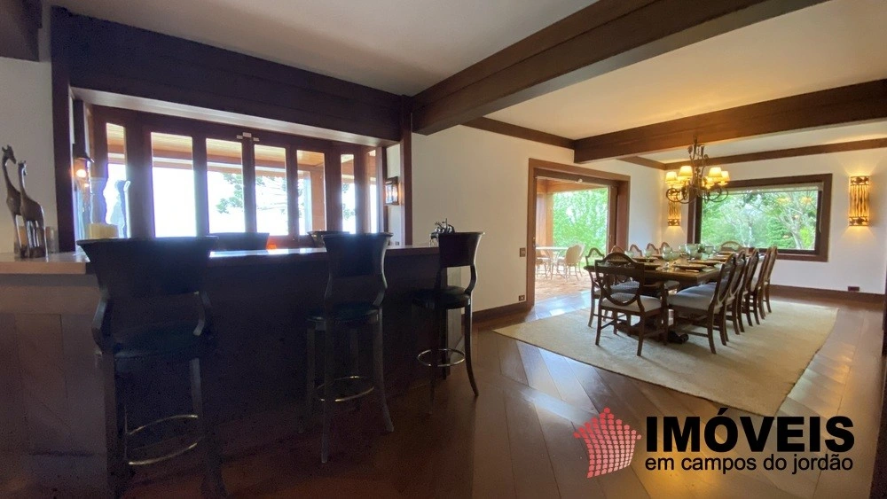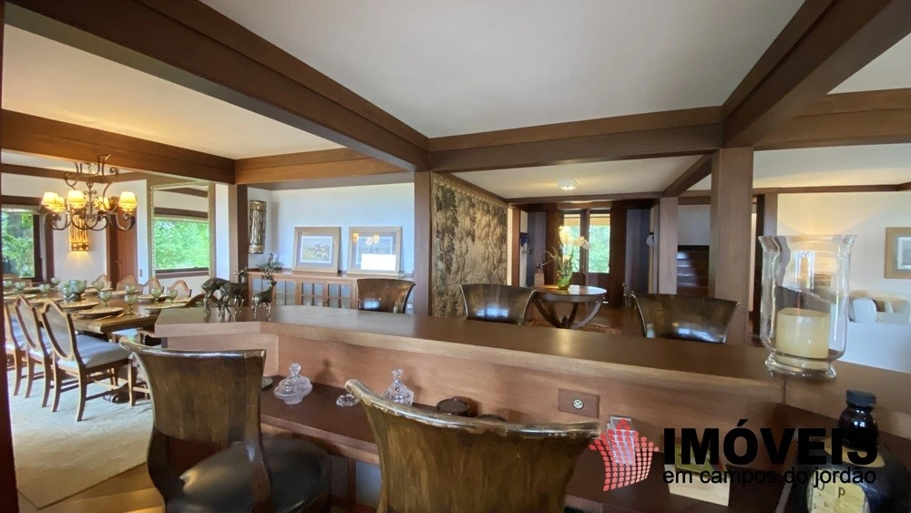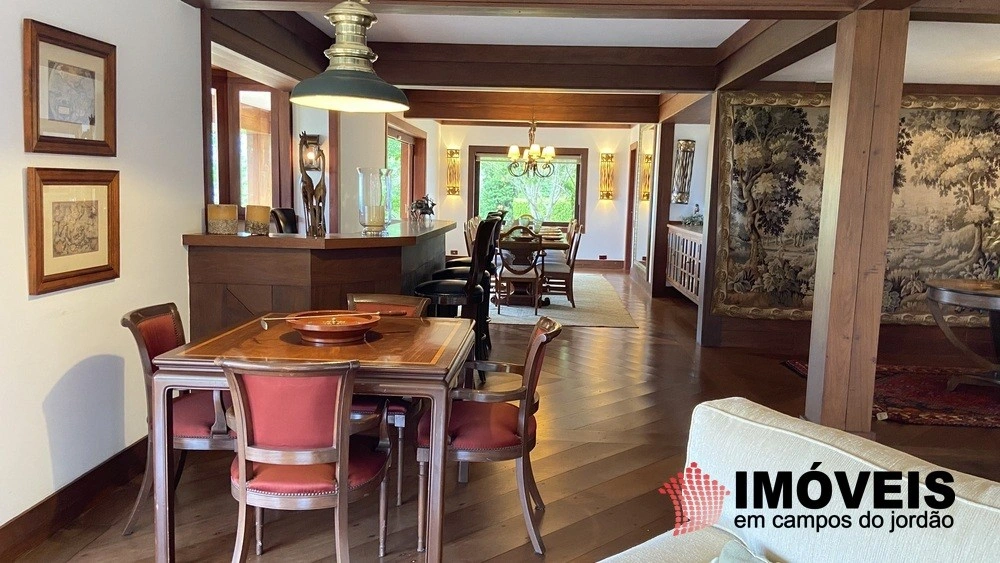 No pavimento principal, o hall de entrada é um espetáculo à parte, com uma porta giratória, onde você é imediatamente recepcionado para a área social, onde se encontra a sala de estar com lareira central, sala de TV, ambas com saída para o jardim e ao lado um bar e uma majestosa sala de jantar com 12 lugares.