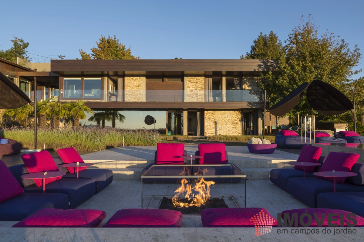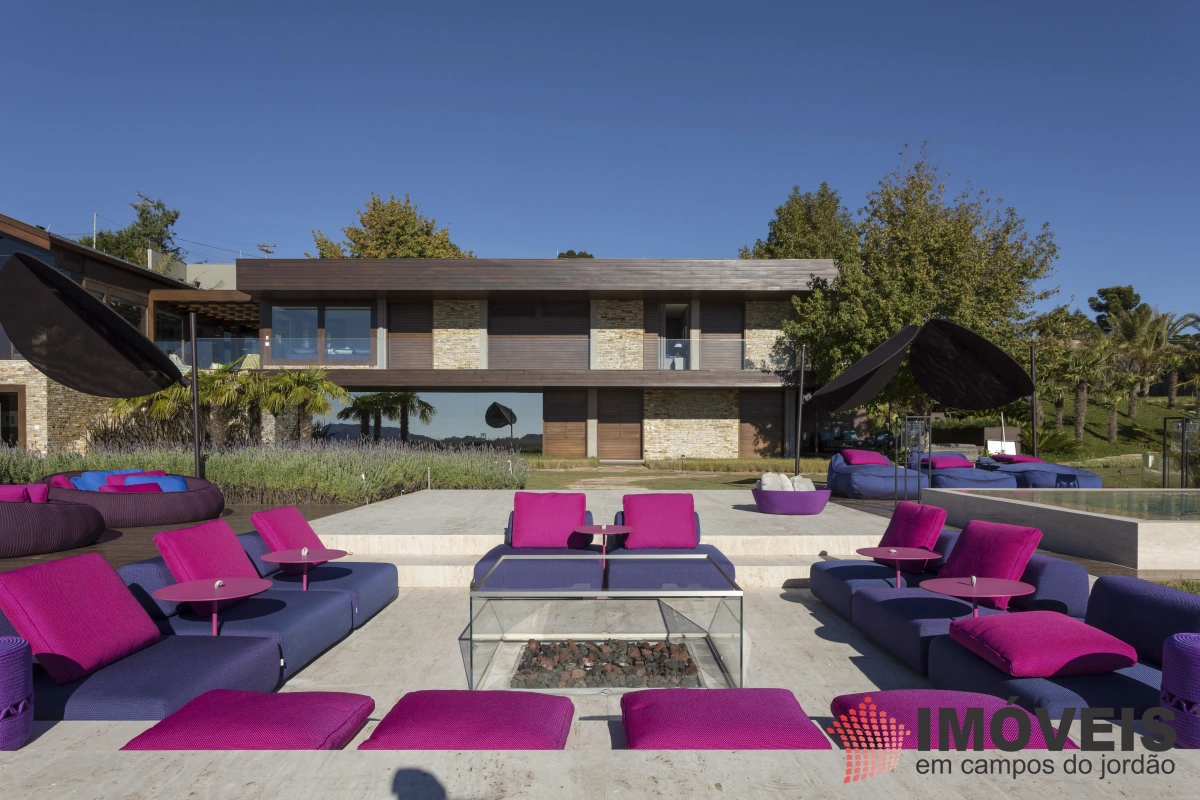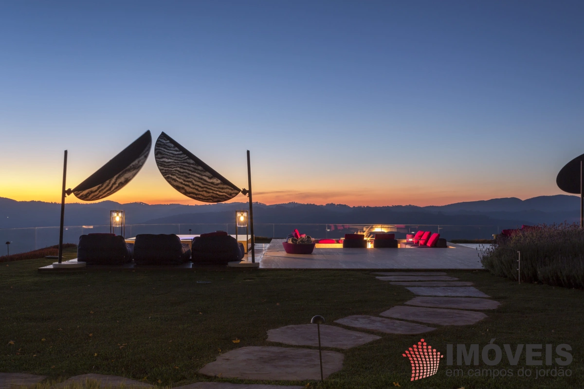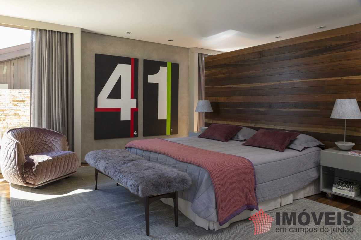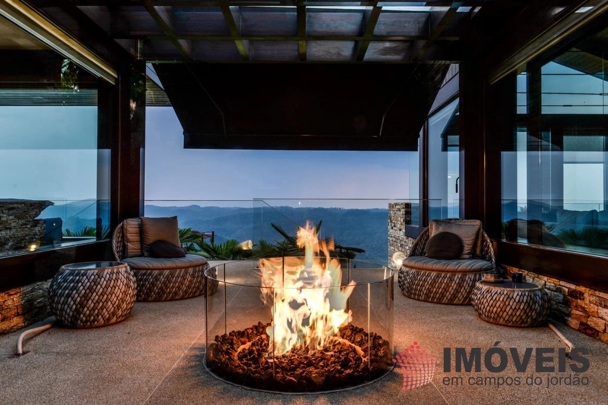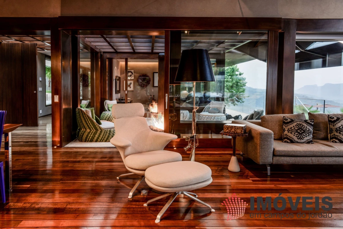 A Casa principal possuí 04 suítes sendo uma máster com telão e vista para a pedra do baú e uma cama super confortável, assinada pelos designers brasileiros “Irmãos Campana”, os banheiros com aquecimento de piso, aquecedores de toalhas, mobiliários Vallve, e metais Hansgrohe. Os dormitórios possuem cama super king com pilou top em pluma de ganso e toda rouparia Trousseau personalizada. Sistema de som e vídeo, aquecimento no piso e armários Kitchens. - Home Theater com sistema de som de primeira geração, TV 80 polegadas. - Lareira Externa a gás e coberta, com mobiliário alemão Dedon. - Living com mesa de jogos e mesa com lareira a butano, sofás italianos Minotti e integração com a sala de Jantar. - Churrasqueira Coberta com mesa Dedon by Stark para até 14 pessoas e varanda integrada com mobiliário Casual Exteriores e aquecedores italianos à gás. - Cozinha com armários Kitchens e equipamentos Kitchenaid, a mesma pode ser integrada ao living e a sala de jantar ou ser fechada para maior privacidade. - Lavanderia com armários e duas Lava e Seca LG. - Garagem com vaga coberta para 03 a 04 automóveis e mais um recuo descoberto para mais 03. - Spa Interno com banheira Versati para até 08 pessoas, TV embutida atrás do espelho, som ambiente, aquecimento de piso, cama de massagem, banheiro privativo e toda rouparia Trousseau personalizada, customizada exclusivamente para a casa. - Spa Externo para aproximadamente 10 pessoas integrado com um ambiente contendo lareira externa e um telão retrátil em Led de 160 polegadas.