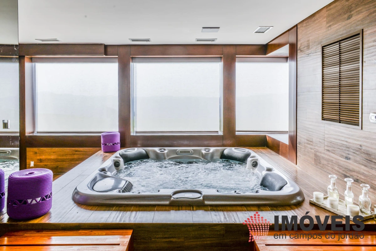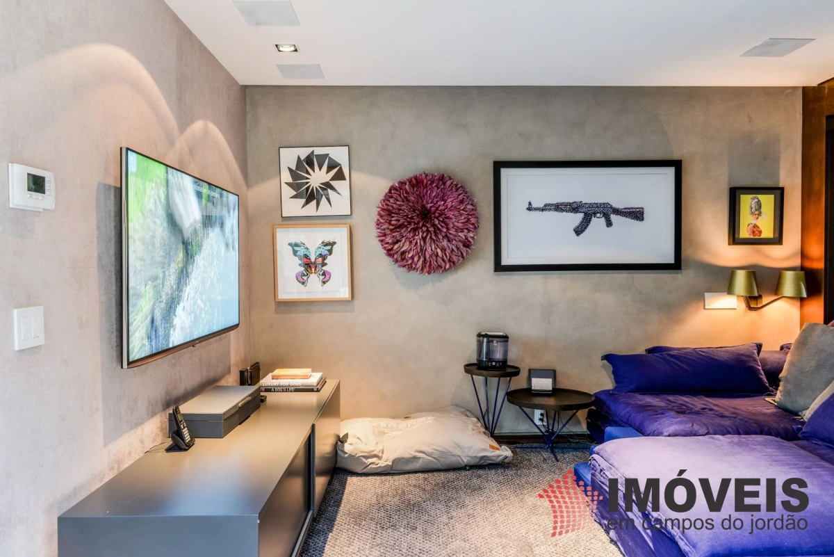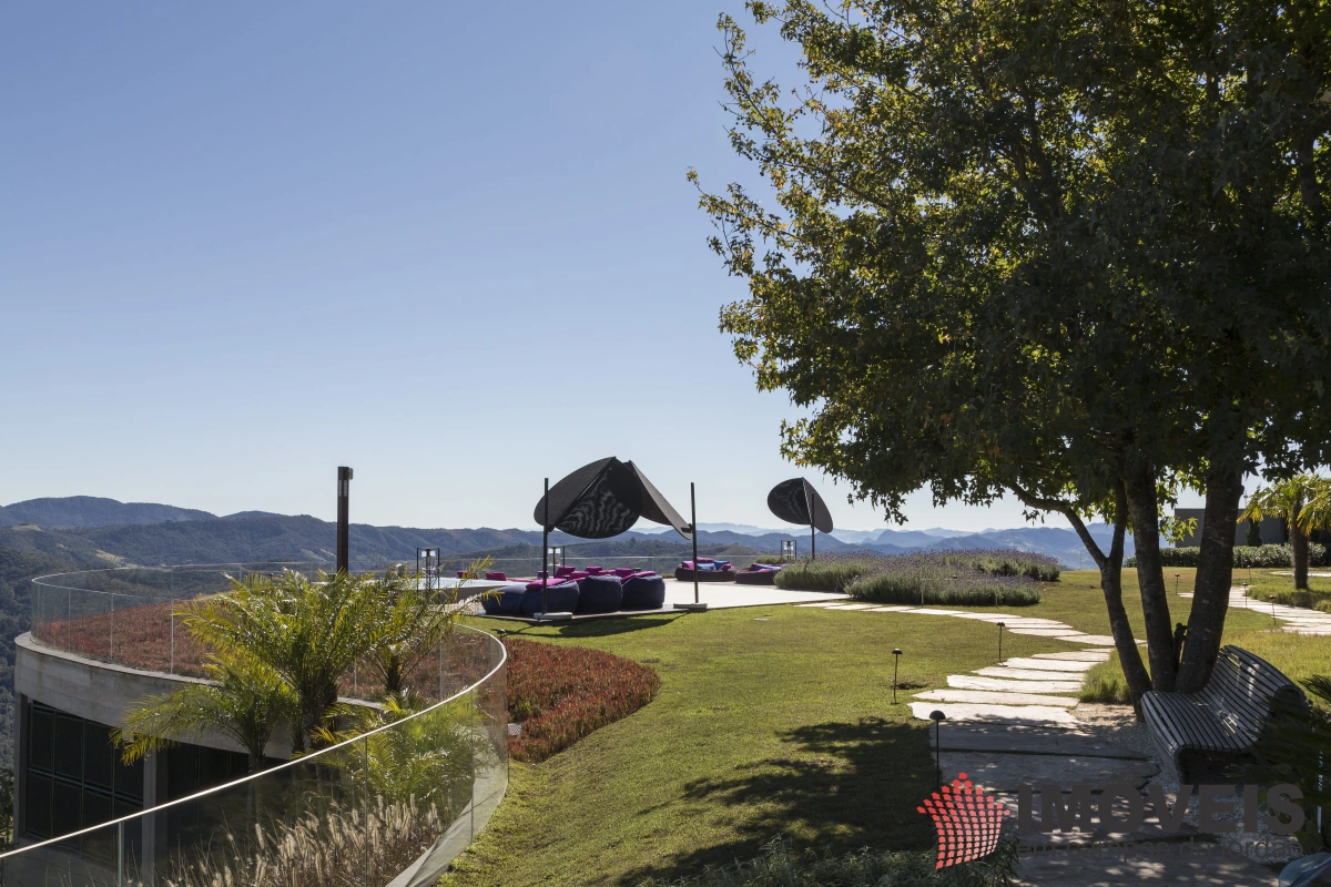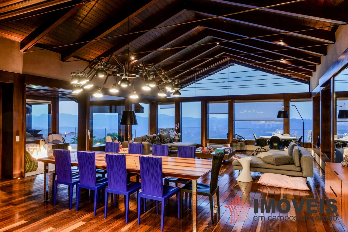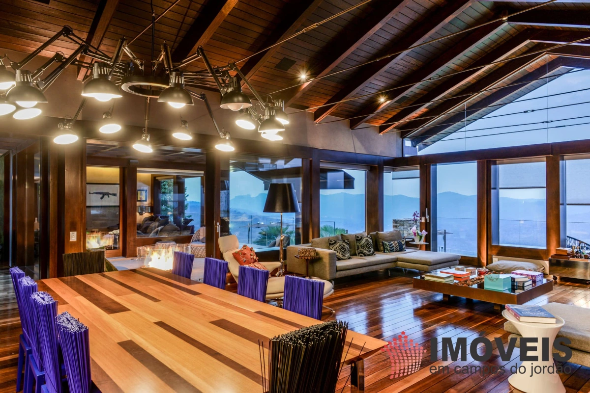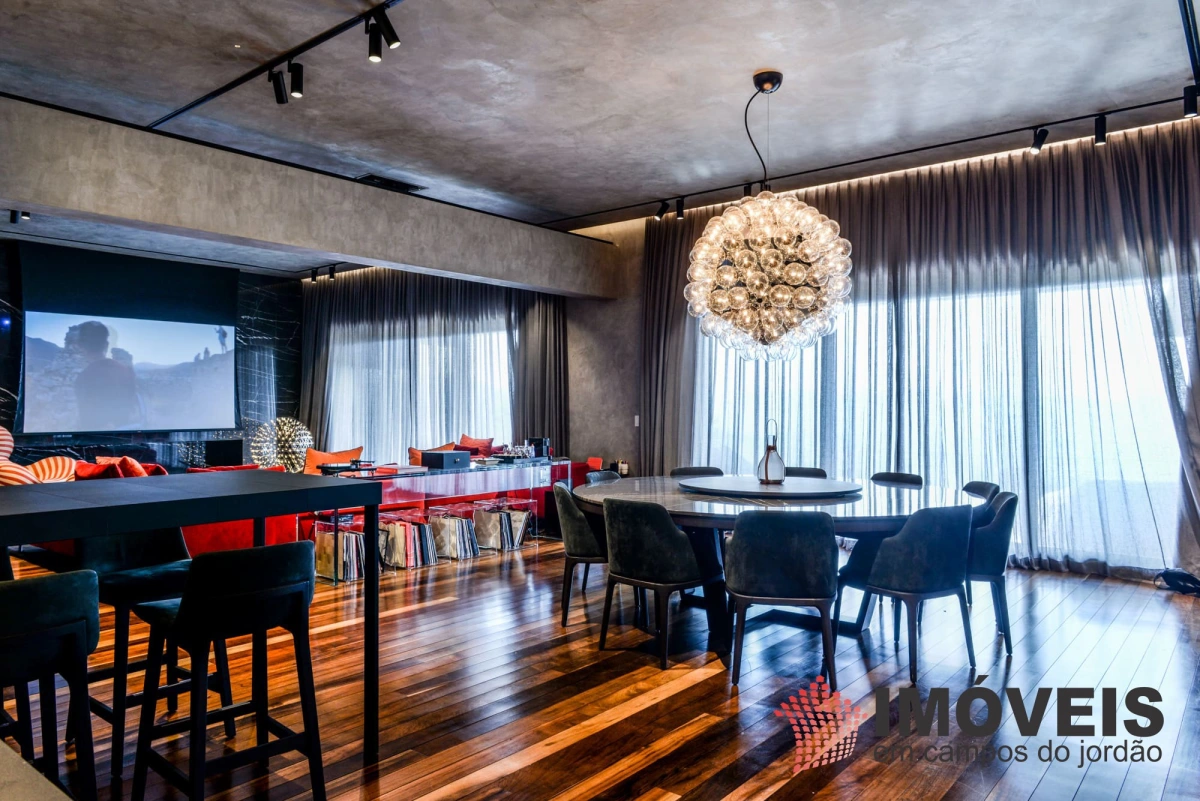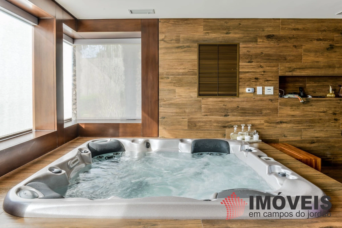 A Casa principal possuí 04 suítes sendo uma máster com telão e vista para a pedra do baú e uma cama super confortável, assinada pelos designers brasileiros “Irmãos Campana”, os banheiros com aquecimento de piso, aquecedores de toalhas, mobiliários Vallve, e metais Hansgrohe. Os dormitórios possuem cama super king com pilou top em pluma de ganso e toda rouparia Trousseau personalizada. Sistema de som e vídeo, aquecimento no piso e armários Kitchens. - Home Theater com sistema de som de primeira geração, TV 80 polegadas. - Lareira Externa a gás e coberta, com mobiliário alemão Dedon. - Living com mesa de jogos e mesa com lareira a butano, sofás italianos Minotti e integração com a sala de Jantar. - Churrasqueira Coberta com mesa Dedon by Stark para até 14 pessoas e varanda integrada com mobiliário Casual Exteriores e aquecedores italianos à gás. - Cozinha com armários Kitchens e equipamentos Kitchenaid, a mesma pode ser integrada ao living e a sala de jantar ou ser fechada para maior privacidade. - Lavanderia com armários e duas Lava e Seca LG. - Garagem com vaga coberta para 03 a 04 automóveis e mais um recuo descoberto para mais 03. - Spa Interno com banheira Versati para até 08 pessoas, TV embutida atrás do espelho, som ambiente, aquecimento de piso, cama de massagem, banheiro privativo e toda rouparia Trousseau personalizada, customizada exclusivamente para a casa. - Spa Externo para aproximadamente 10 pessoas integrado com um ambiente contendo lareira externa e um telão retrátil em Led de 160 polegadas.