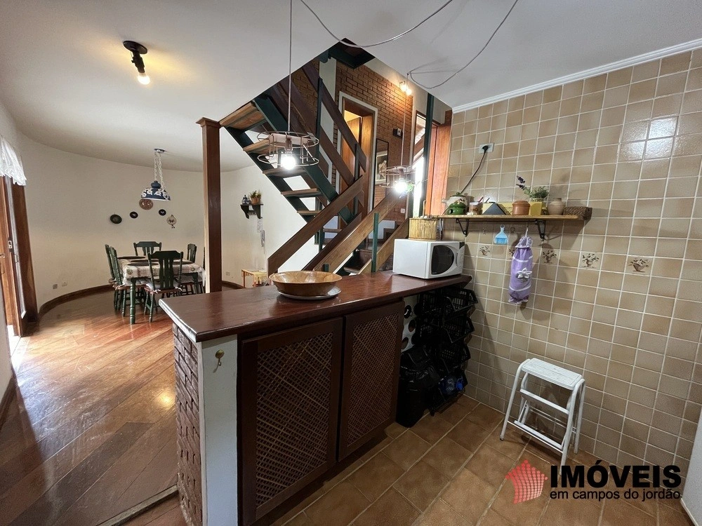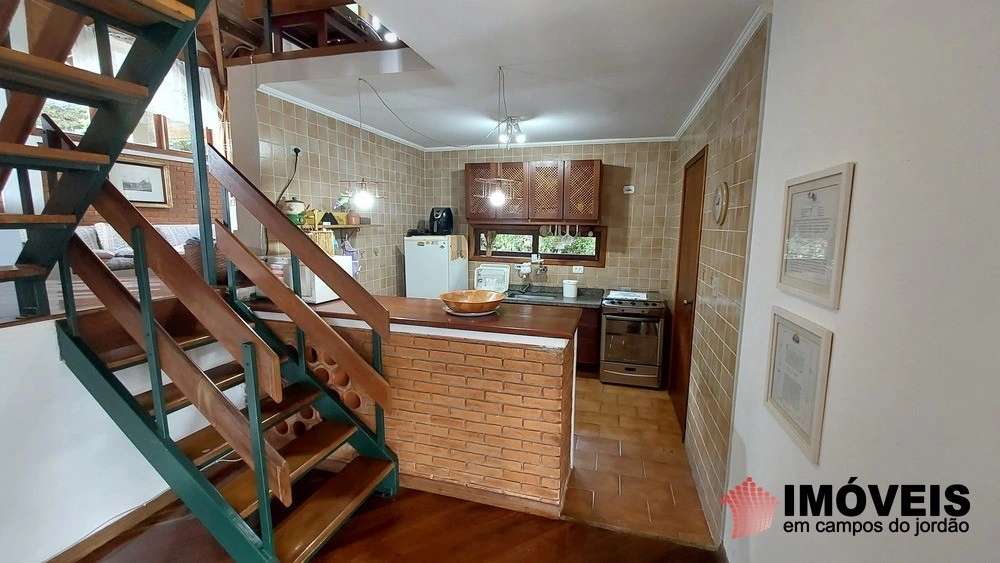 E no primeiro piso sala de estar rebaixada com lareira, lavabo e seis degraus abaixo cozinha toda equipada conjugada a uma ampla sala de jantar.
