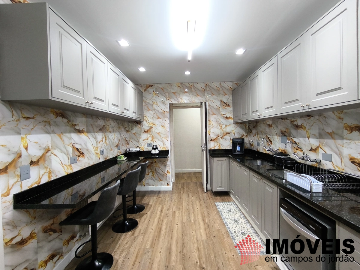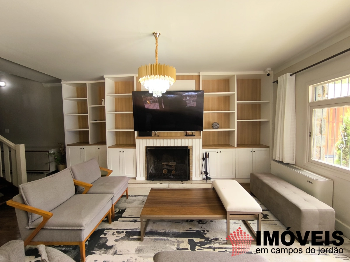 Os ambientes sociais são amplos e convidativos, aquecidos pela lareira e com aberturas que valorizam a luz natural e a vista para o jardim. A cozinha, nova e planejada, integra funcionalidade e convivência, ideal para quem aprecia receber.