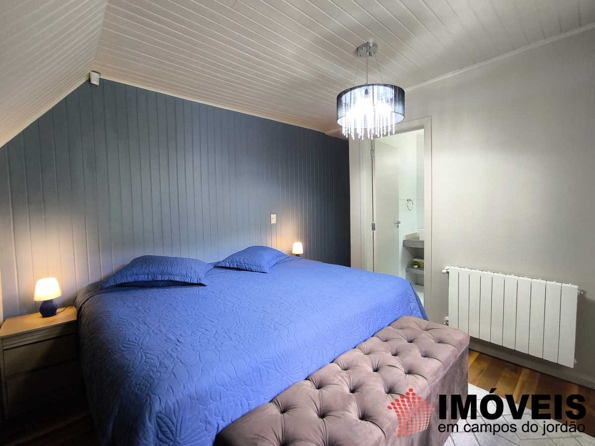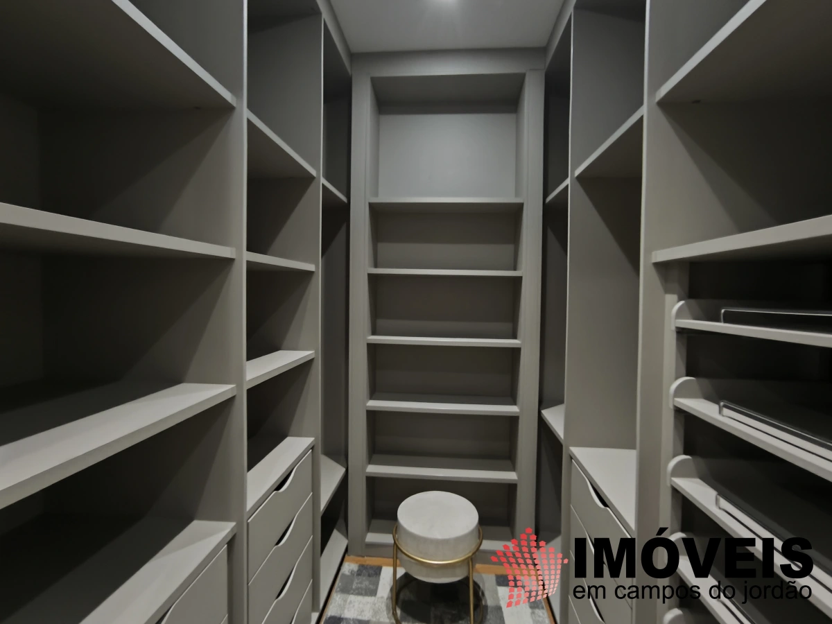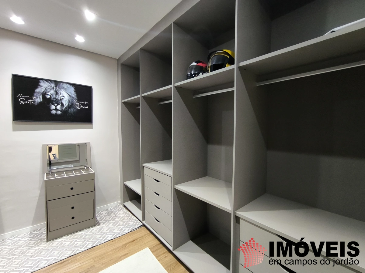 A área íntima conta com cinco dormitórios, sendo três suítes. A suíte master é um destaque especial: espaçosa, com closet duplo (Sr. e Sra.) e um banho pensado para o descanso, com banheira de imersão, onde o tempo desacelera e o contato com a tranquilidade da serra se torna ainda mais intenso.