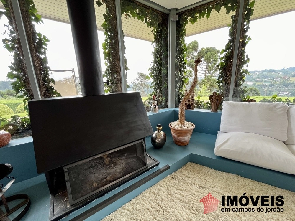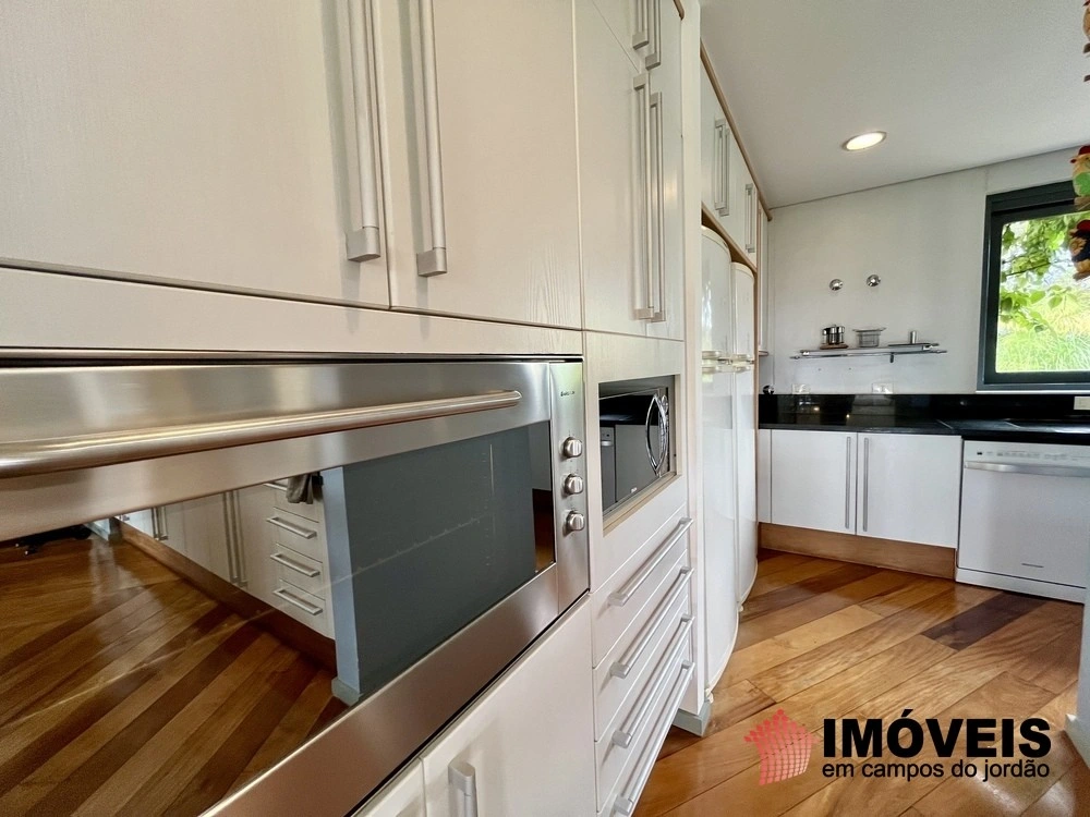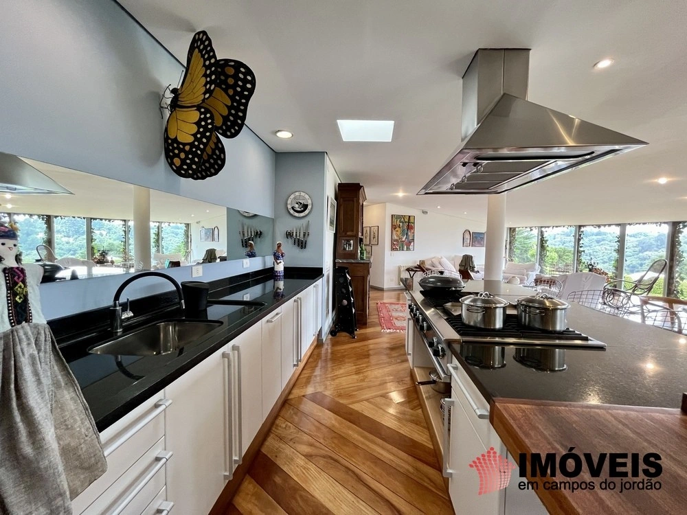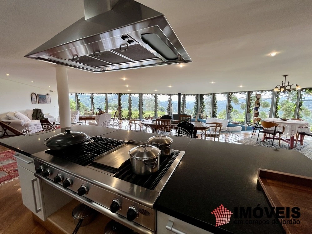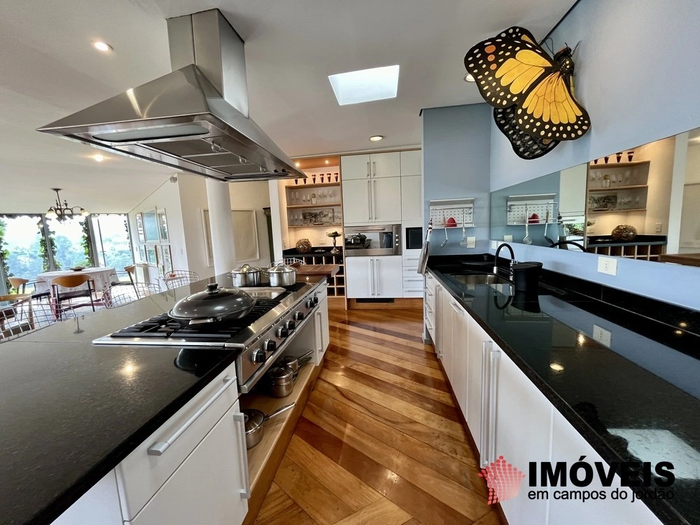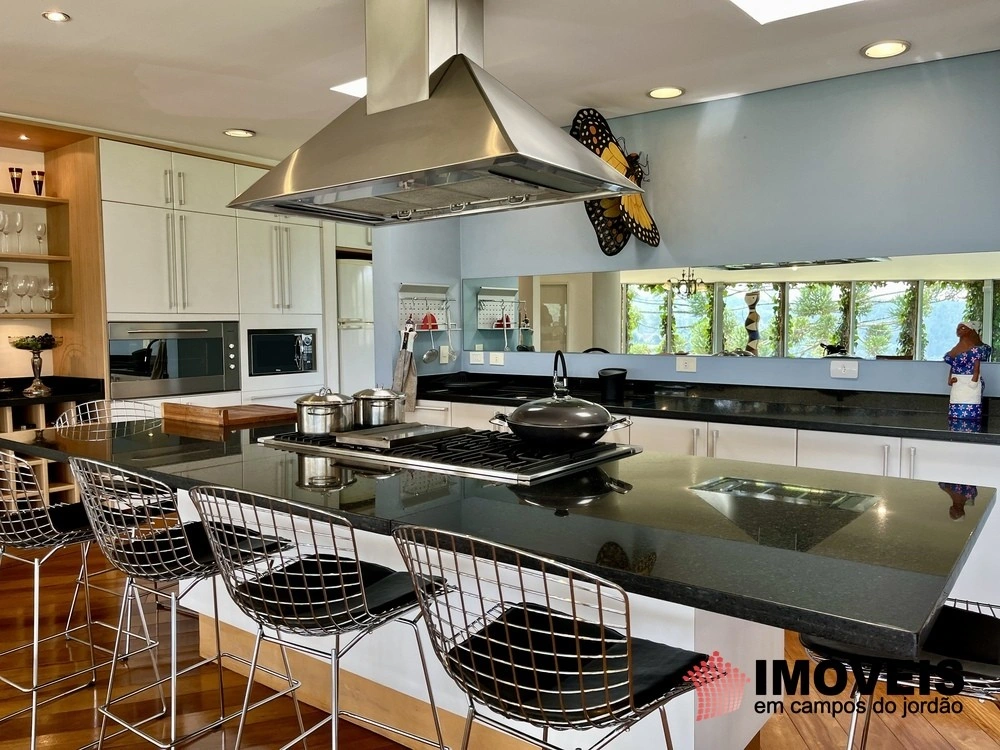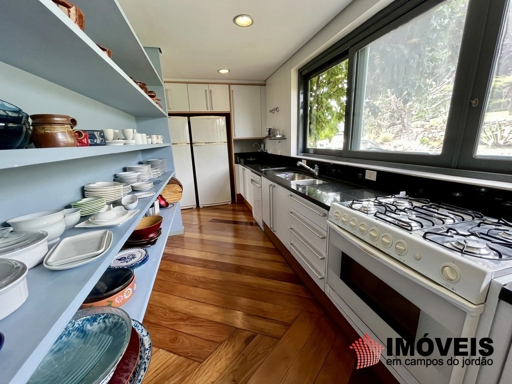 Cozinha toda equipada com ilha central, mármore São Gabriel com fogão industrial, móveis planejados, mais cozinha gourmet, despensa, várias salas de estar com vista para o jardim e um grande charme é a fachada envidraçada com trepadeiras o que cria um clima de serra e campo, iluminação perfeita, lavanderia ampla, depósito de lenha, garagem e amplo jardim com mesa e bancos para curtir o sol da montanha.