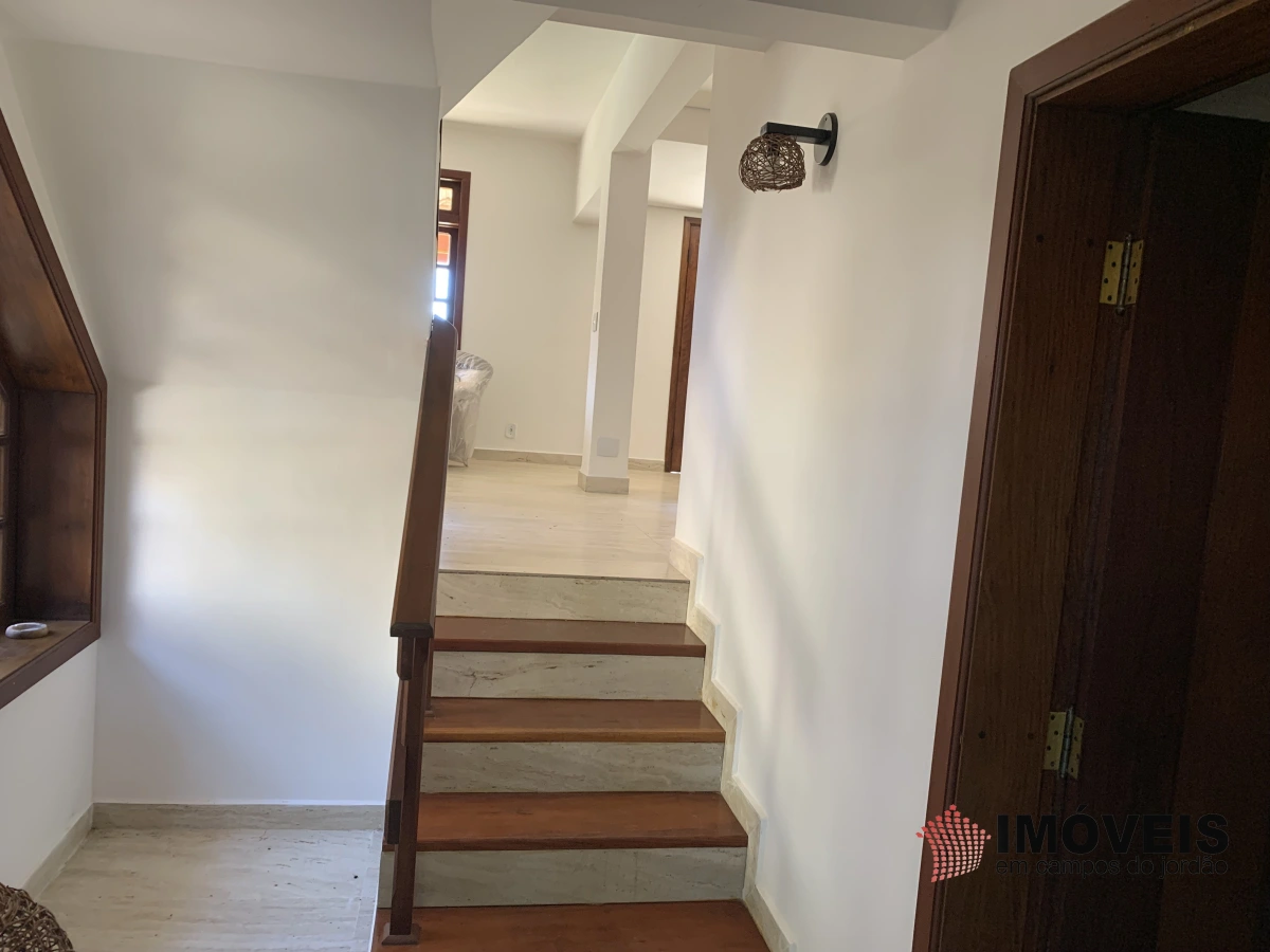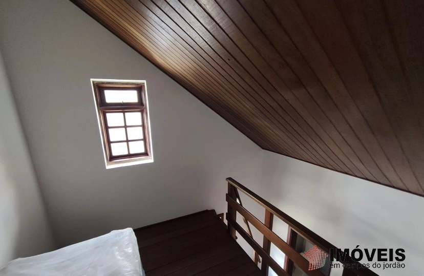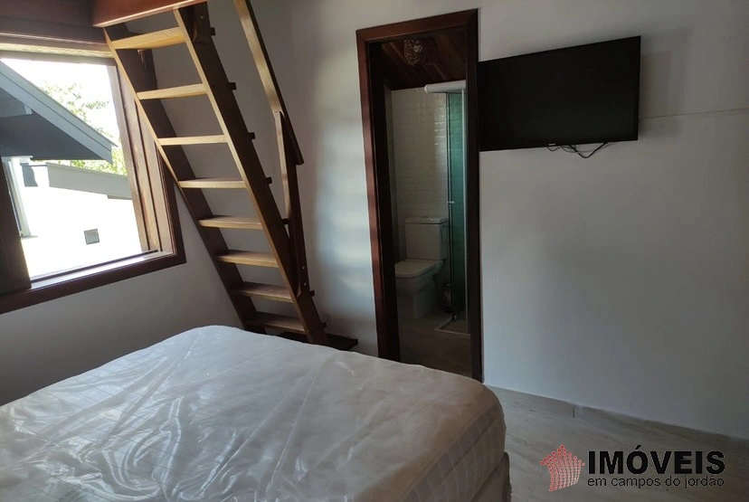 A parte superior do imóvel possuí 02 dormitórios sendo 01 suíte com mezanino acima que pode virar closet ou até dormitório. Mais quatro degraus acima, uma sala com pé direito alto e suíte espaçosa e aconchegante com televisão de 50 polegadas.
