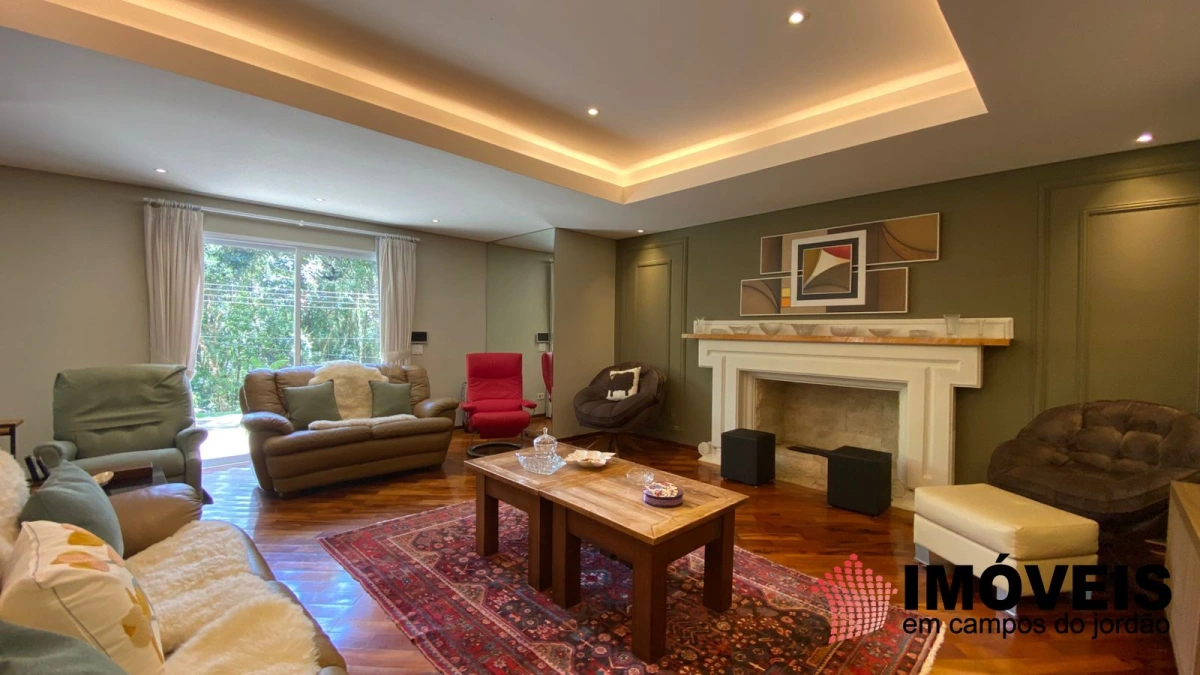 Ampla sala de estar e TV com lareira, iluminação moderna e saída para o jardim.